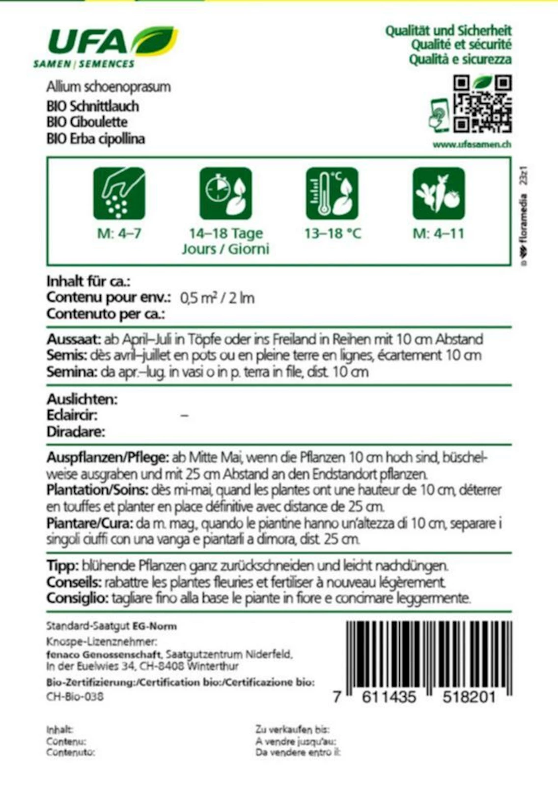 Bio-Schnittlauch mit aromatischen Halmen. Ab Frühling laufend erntbar, ideal frisch für Salate, Suppen, Quark und Eierspeisen.