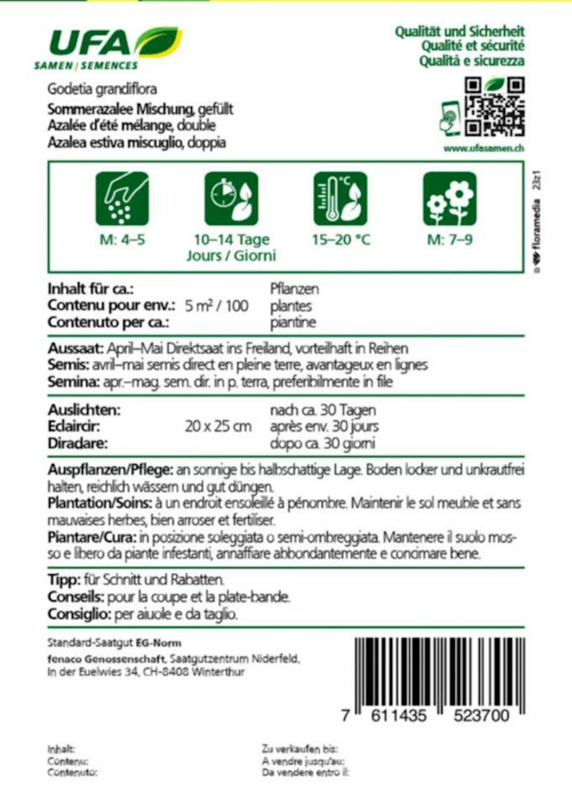 Die Godetia grandiflora, auch als Azalea bekannt, ist eine einjährige Sommerblume mit zarten, lanzettlichen Blättern und auffälligen, becherförmigen Blüten in kräftigen Farben wie Rosa, Lila, Rot oder Weiss. Sie erreicht eine Wuchshöhe von etwa 30–60 cm und eignet sich hervorragend für Beete, Rabatten, Balkonkästen und als Schnittblume. Ihre farbenfrohen Blüten bringen lebendige Akzente in den Garten und ziehen Bienen und Schmetterlinge an.