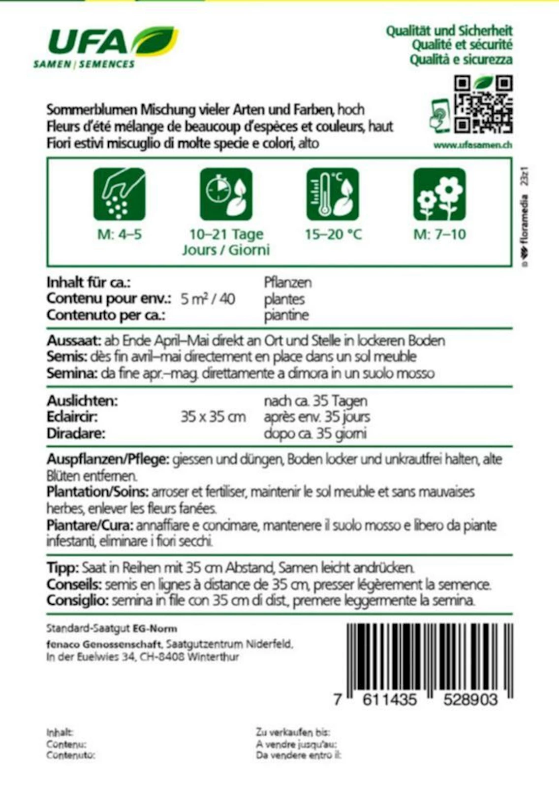 Die Sommerblumenmischung enthält viele einjährige Pflanzen in kräftigen und zarten Farben. Sie bringt Abwechslung in Beete, Rabatten und Kübel. Die verschiedenen Blütenformen und -höhen wirken natürlich und harmonisch. Ausserdem bieten die Blumen wichtigen Nektar für Bienen, Schmetterlinge und andere Bestäuber.