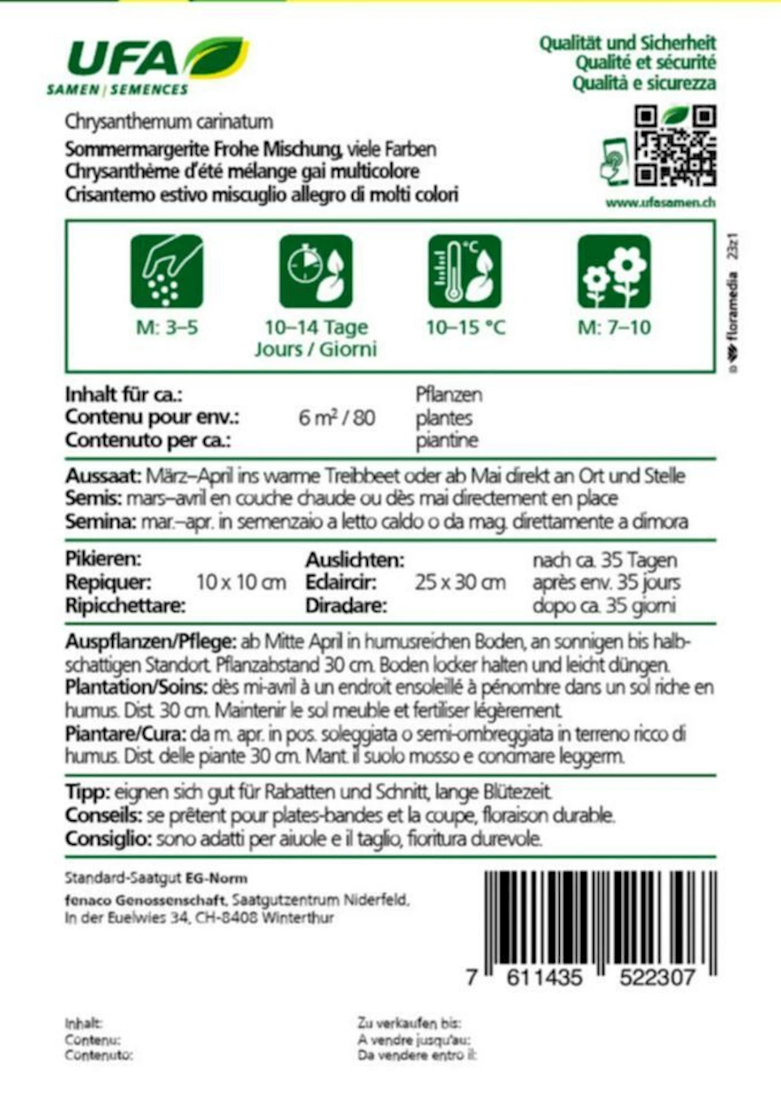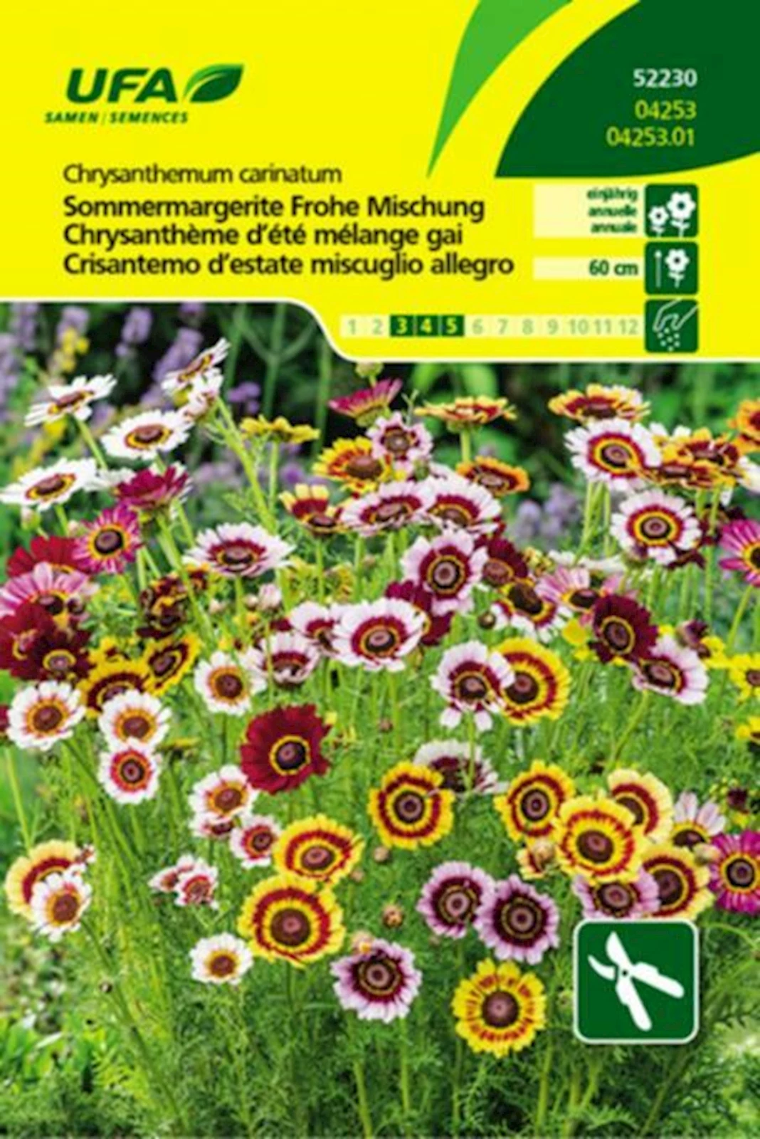 Chrysanthemum carinatum, auch als Sommermargerite bekannt, ist eine einjährige, dekorative Pflanze mit fein gefiederten Blättern und auffälligen, bunten Blüten in Weiss, Gelb, Rosa, Rot oder Violett. Sie wächst aufrecht und erreicht eine Höhe von 30–60 cm, je nach Sorte und Standort. Die Sommermargerite eignet sich hervorragend für Beete, Rabatten und Bauerngärten. Ihre Blüten ziehen Bienen, Schmetterlinge und andere bestäubende Insekten an.