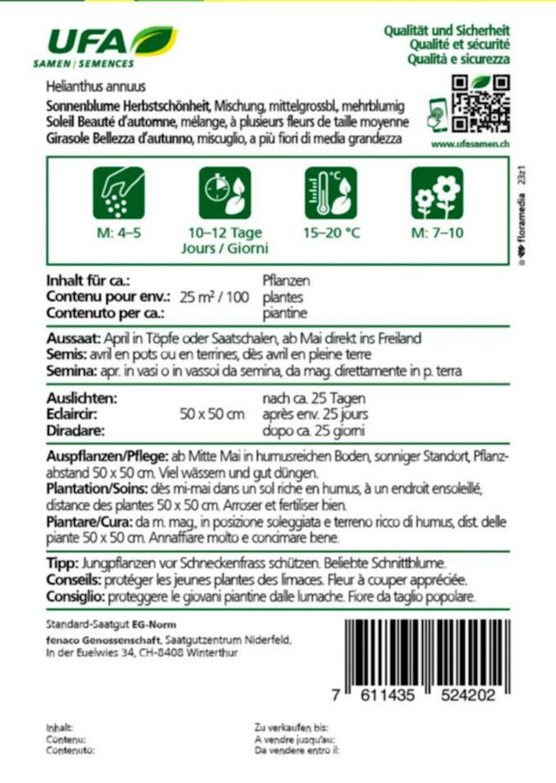 Die Sonnenblume 'Herbstschönheit' kann ab Mitte April direkt ins Freie gesät werden. Wer früher Blüten sehen möchte, kann schon ab März im Haus oder Frühbeet vorziehen. Damit sie lange blüht, bis in den Herbst hinein, lohnt sich eine gestaffelte Aussaat bis Anfang Juni. Herbstschönheit passt gut in naturnahe Gärten, Blumenbeete und eignet sich auch als schöne Schnittblume für spätsommerliche Sträusse. Besonders gut kombiniert man sie mit Zinnien, Cosmeen oder Kornblumen.