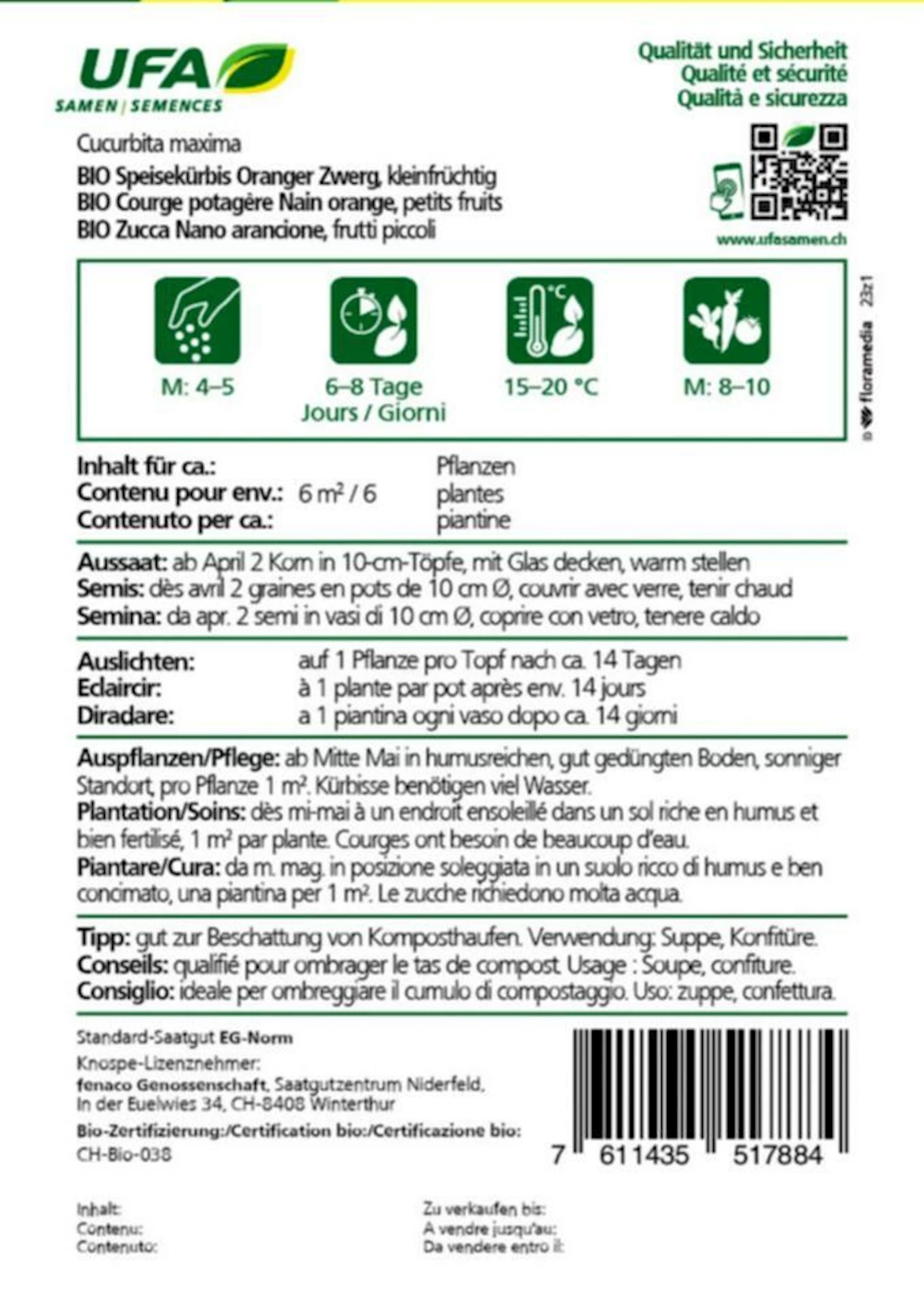 Cucurbita maxima ‘Oranger Zwerg’ ist frostempfindlich und darf erst nach den Eisheiligen ins Freie gesetzt werden. Jungpflanzen aus der Vorkultur müssen vorsichtig abgehärtet werden.
