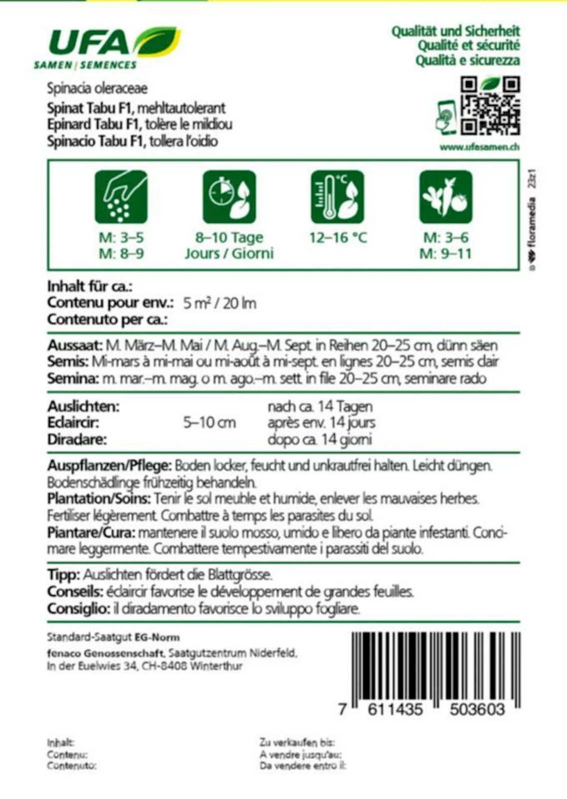 Spinat Tabu ist ein robustes, kälteverträgliches Blattgemüse mit grossen, zarten, dunkelgrünen Blättern. Es wächst schnell, ist Mehltau-tolerant und eignet sich ideal zum Kochen, Dünsten oder für frische Salate.