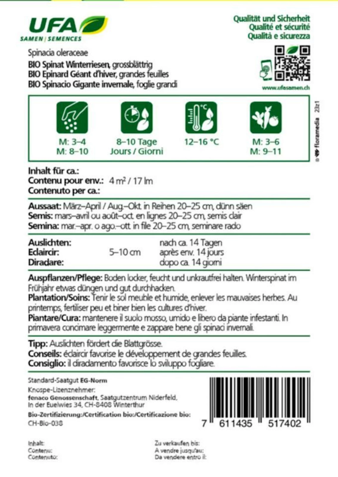 Um die Blattproduktion zu steigern, regelmässig die äusseren Blätter ernten. Eine Mulchschicht aus Kompost oder Laub hält den Boden feucht und unterstützt das Wurzelwachstum. Spinat eignet sich für Gemüsebeete, Hochbeete oder grössere Kübel und kann als Haupt- oder Zwischensaat angebaut werden. Besonders gut für Herbst- und Winterernte geeignet.