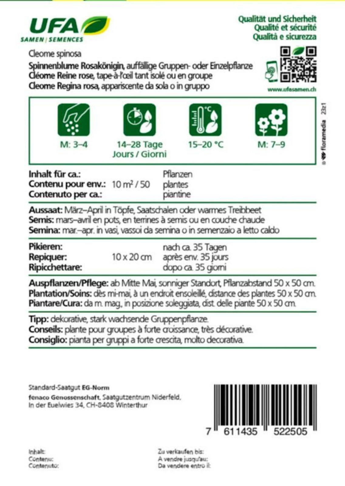 Die Cleome spinosa ist frostempfindlich und sollte erst nach den Eisheiligen ins Freie gesät oder gepflanzt werden. Bei früher Aussaat im Haus ist es wichtig, die Jungpflanzen langsam an die Aussentemperaturen zu gewöhnen. Die Spinnenblume wächst kräftig und hoch, bei Bedarf eine Pflanzenstütze verwenden. Während des Wachstums auf ausreichende Luftzirkulation achten, um Pilzkrankheiten zu vermeiden.