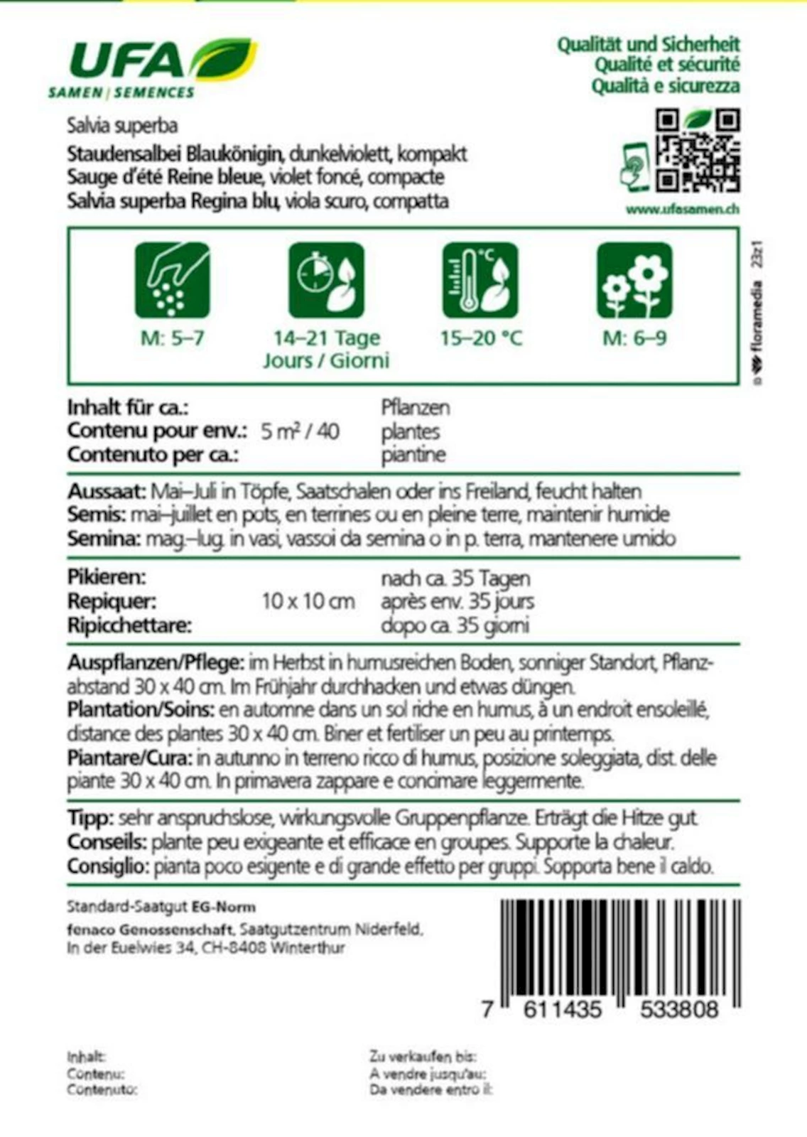 Salvia superba, auch bekannt als Staudensalbei, ist eine mehrjährige Staude mit auffälligen, tiefblauen Blütenrispen. Sie erreicht eine Höhe von 60–90 cm und ist ideal für Beete, Rabatten und als Bienen- und Schmetterlingsmagnet geeignet.