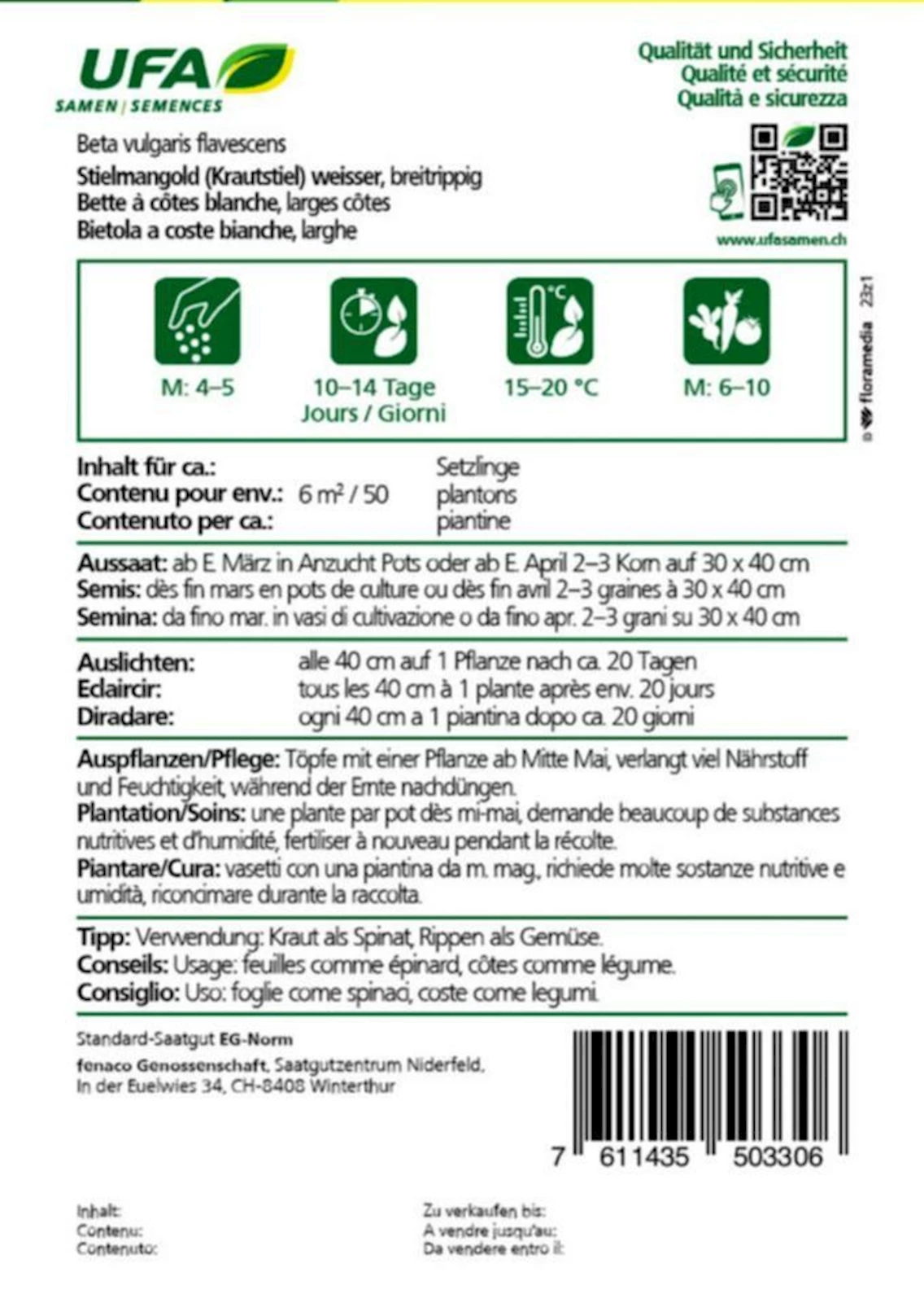 Eine robuste, ertragreiche Mangoldsorte mit hellen Stielen und dunkelgrünen Blättern, ideal für Gemüsebeete, Hochbeete und Hausgärten.