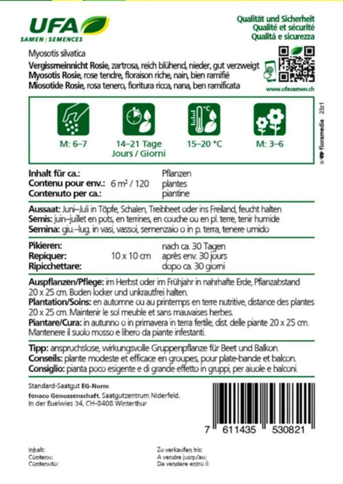 Für eine reiche Blüte empfiehlt sich eine Aussaat von Mai bis Juli direkt ins Beet oder in Saatschalen. Jungpflanzen können im Herbst oder zeitigen Frühjahr ausgepflanzt werden. Das Vergissmeinnicht ‘Rosie’ sät sich leicht selbst aus und sorgt so für jährliche Bestände. Verblühte Blütenstände regelmässig entfernen, um ein gepflegtes Erscheinungsbild zu erhalten.