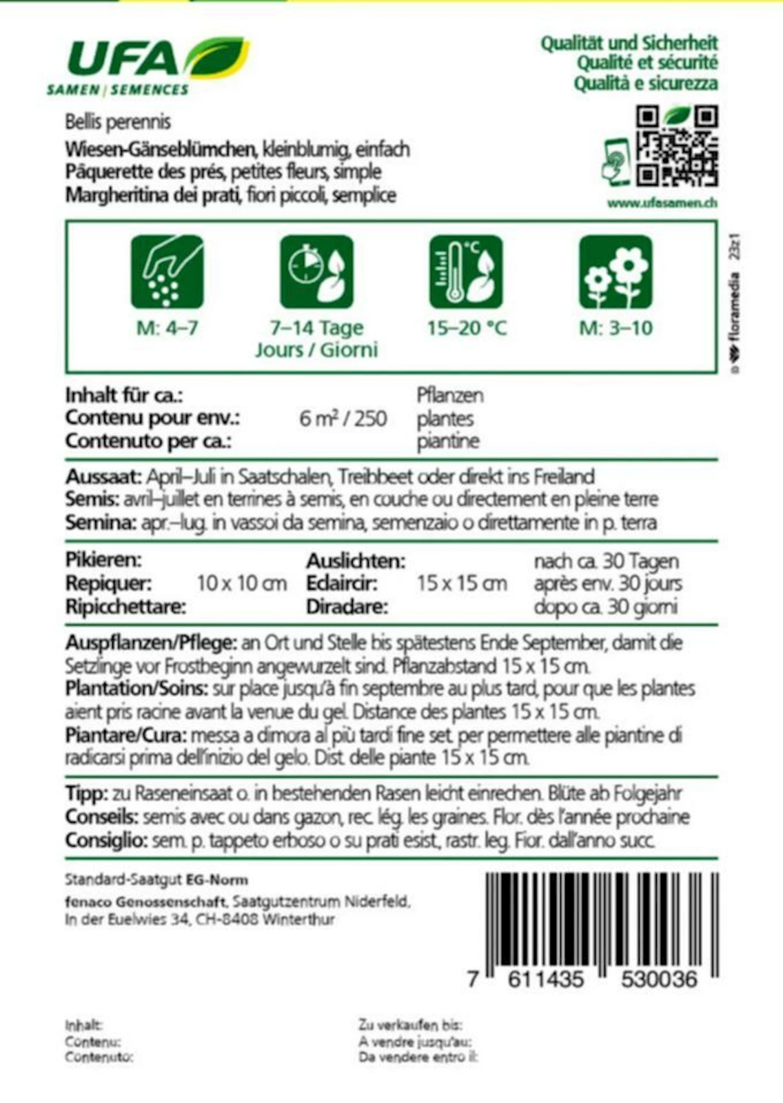 Auspflanzen an Ort und Stelle bis spätestens Ende September, damit die Setzlinge vor Frostantritt angewurzelt sind. Pflanzabstand 15 × 15 cm.