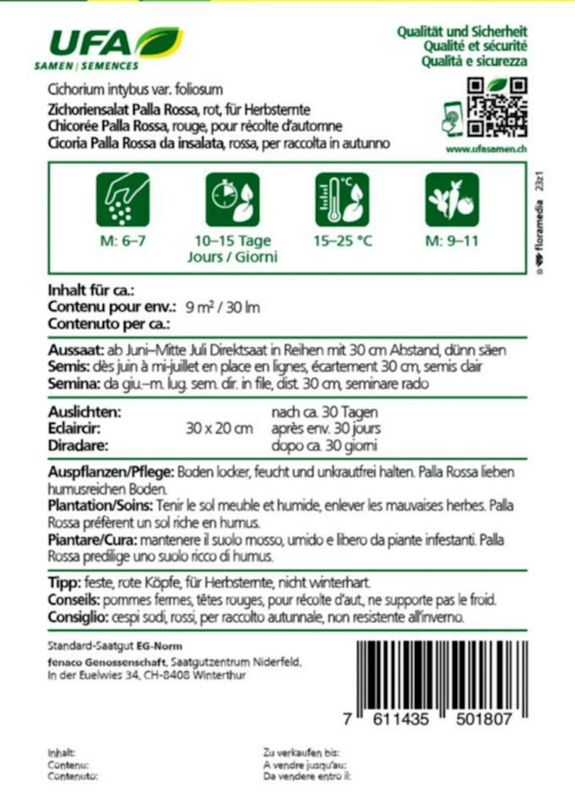 Cichorium intybus var. foliosum ‘Palla Rossa’, auch als Zichoriensalat Palla Rossa bekannt, ist eine traditionelle, ertragreiche Sorte. Sie bildet kompakte, kugelförmige Köpfe mit intensiv rot gefärbten Blättern und weissen Rippen. Der Geschmack ist aromatisch, leicht bitter und besonders geschätzt für herzhafte Wintersalate.