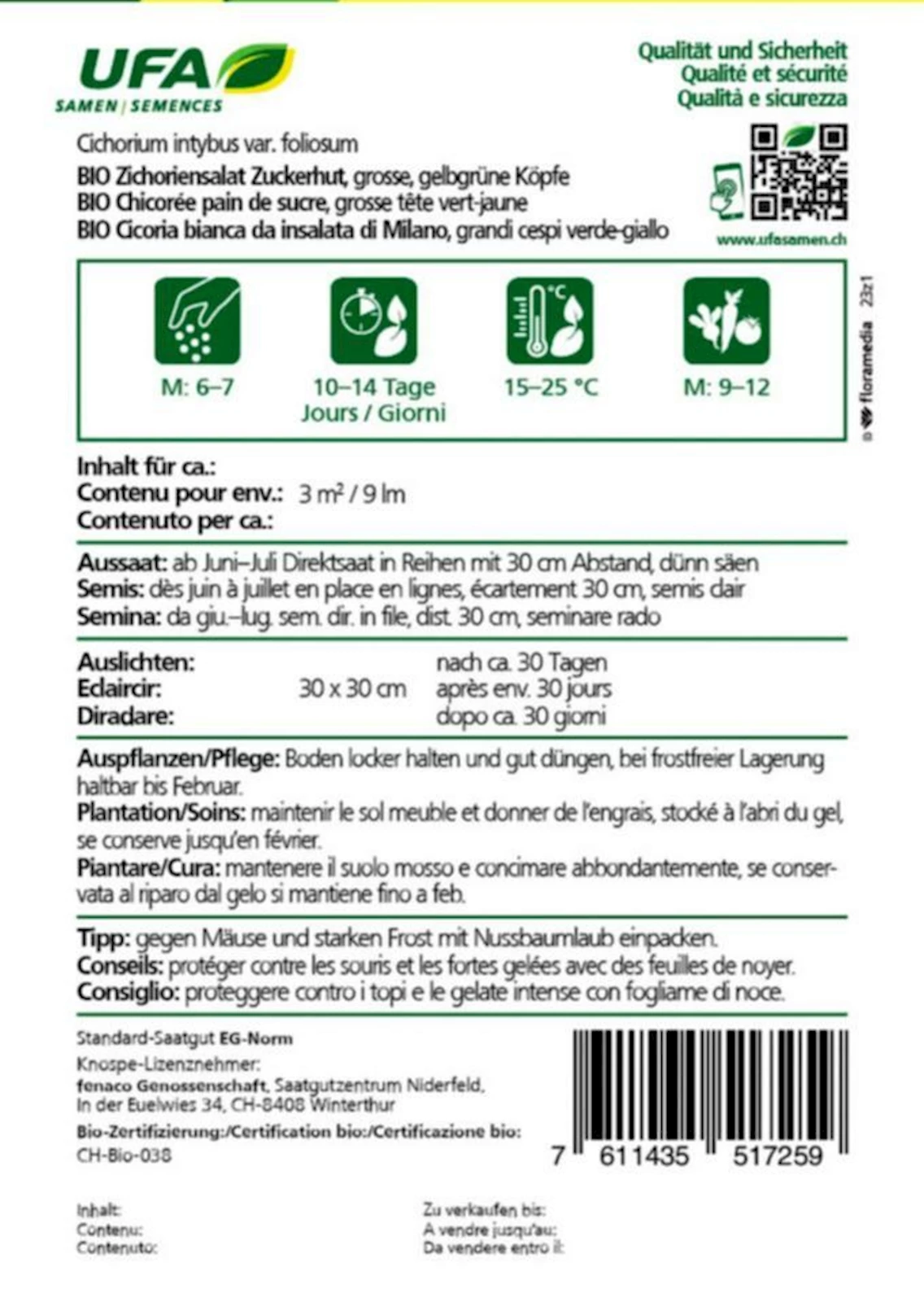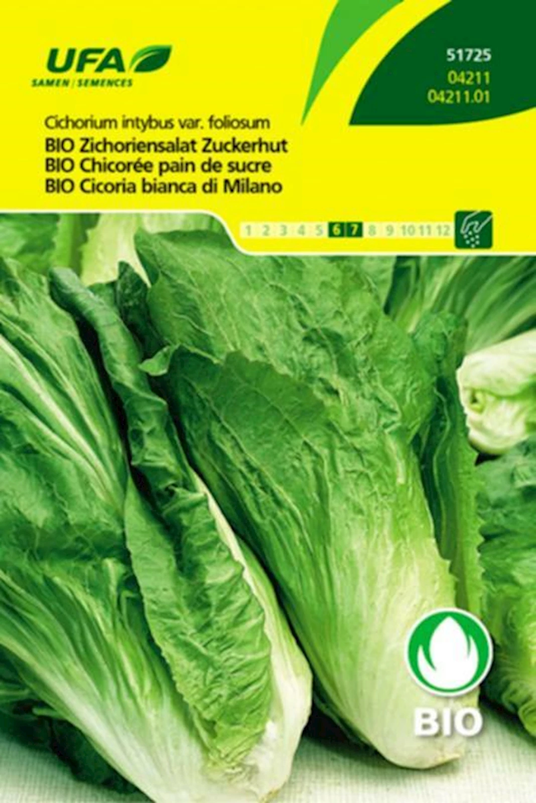 Cichorium intybus var. foliosum ‘Zuckerhut’, auch als Zichoriensalat Zuckerhut bekannt, ist eine bewährte, ertragreiche Sorte. Sie bildet kompakte, spitz zulaufende Köpfe mit hellgrünen, feingekrausten Blättern und mild-bitterem, aromatischem Geschmack. Besonders geeignet für frische Salate im Herbst und Winter.