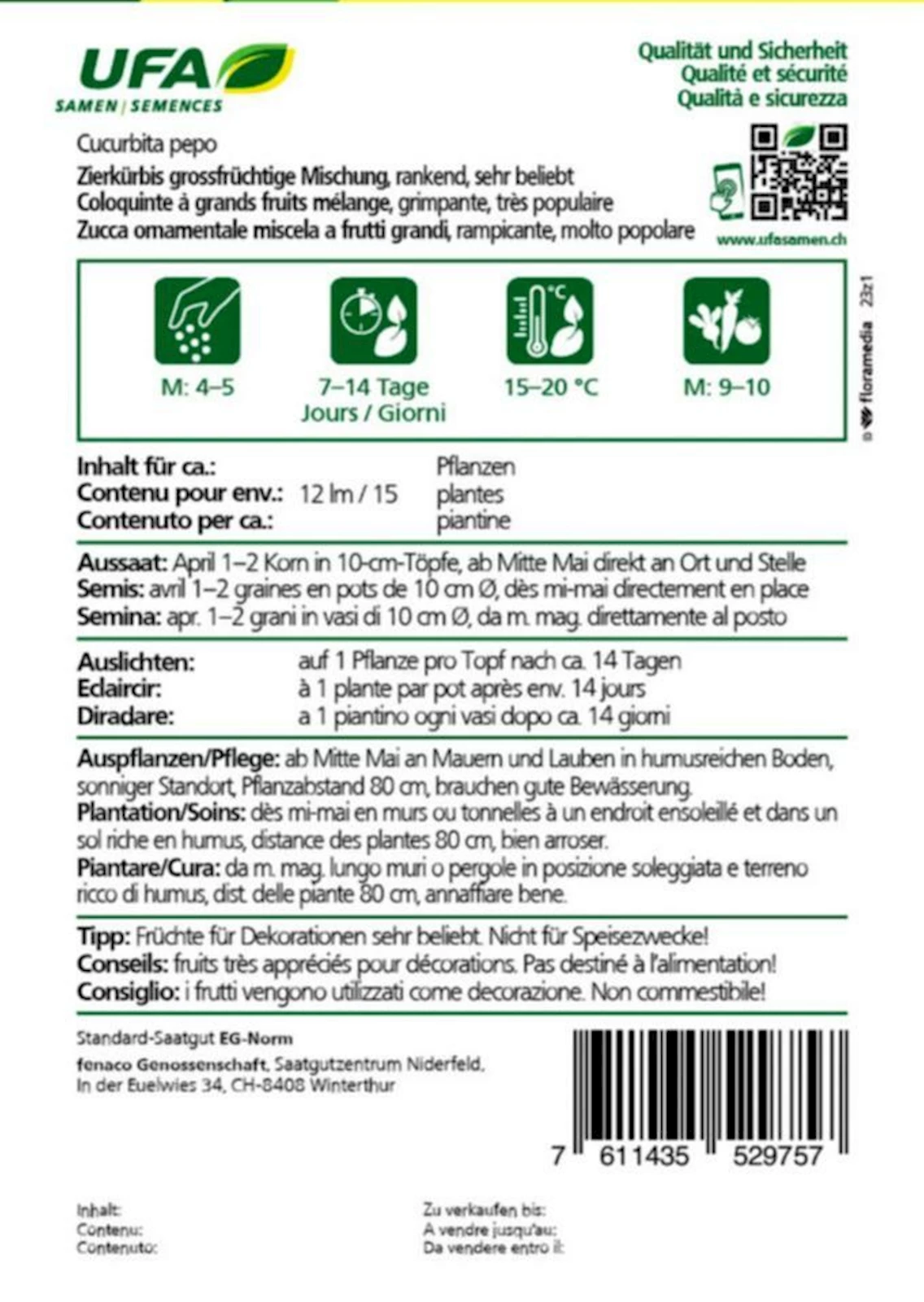 Cucurbita pepo ist frostempfindlich und darf erst nach den Eisheiligen ins Freie. Vorkultivierte Jungpflanzen müssen vorsichtig abgehärtet werden.