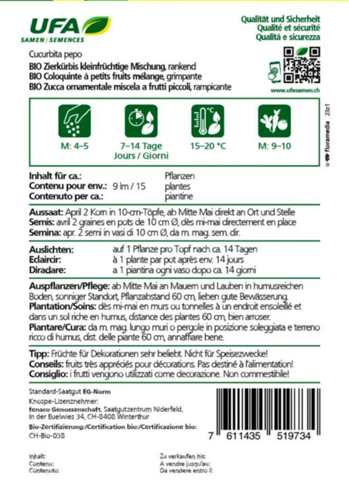 Cucurbita pepo ist frostempfindlich und darf erst nach den Eisheiligen ins Freie. Vorkultivierte Jungpflanzen sollten langsam an die Aussentemperaturen gewöhnt werden.