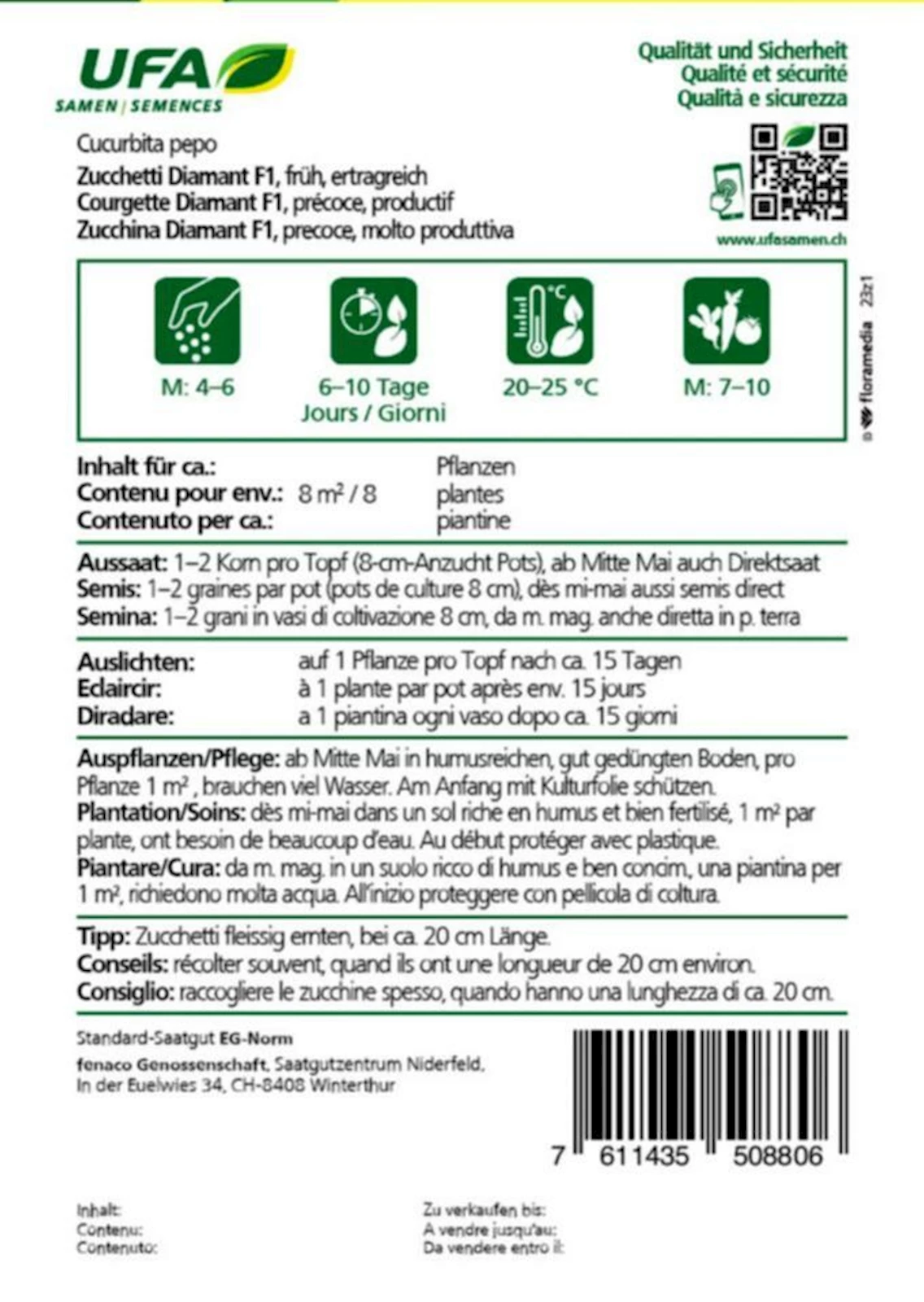 Zucchetti sind frostempfindlich und sollten erst nach den Eisheiligen ins Freie gesät oder gepflanzt werden. Jungpflanzen aus dem Hausanbau langsam an die Aussentemperaturen gewöhnen.