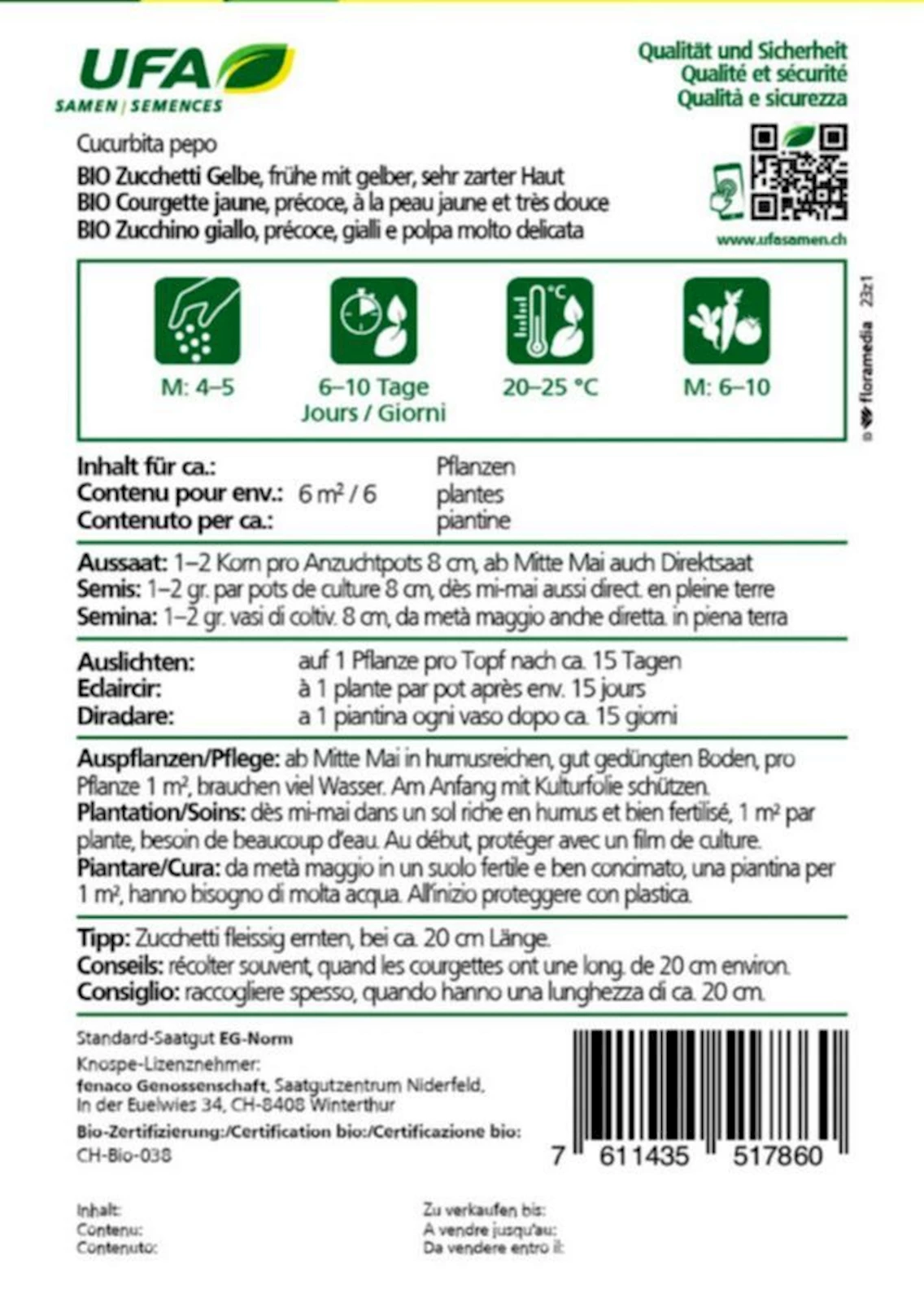 Cucurbita pepo, gelbe Zucchetti, ist ein beliebtes, wärmeliebendes Gemüse, das mit seinen länglichen, gelben Früchten in der Küche vielseitig verwendet werden kann. Die Pflanze wächst schnell, bildet grosse, raue Blätter und auffällige gelbe Blüten. Unter guten Bedingungen erreicht sie eine Höhe von etwa 40–60 cm und wächst buschig bis leicht rankend.