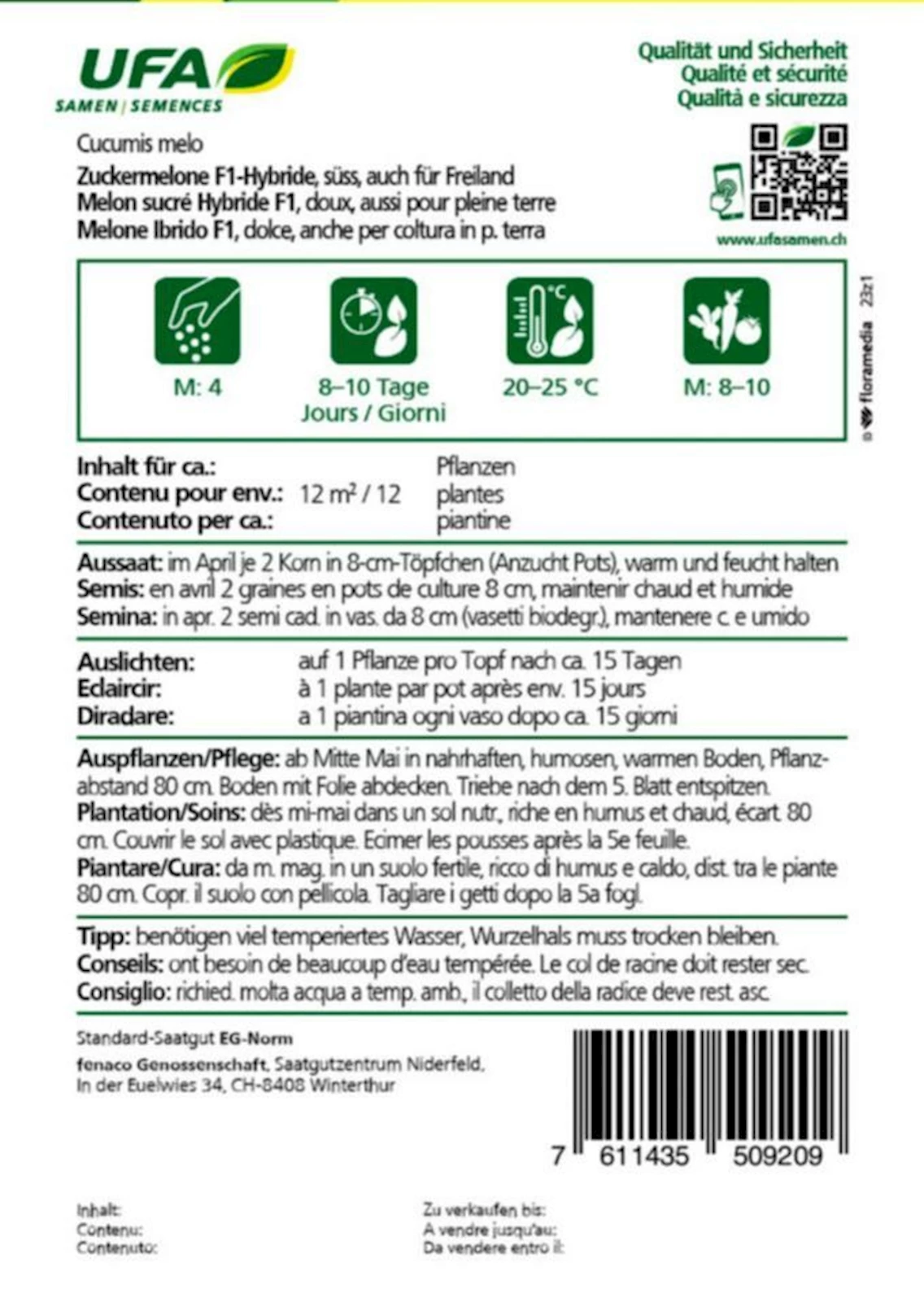 Zuckermelonen sind frostempfindlich und dürfen erst nach den Eisheiligen ins Freiland. Voranzucht im Haus möglich, Jungpflanzen langsam abhärten. Rankhilfe empfiehlt sich für grössere Sorten, um Fruchtfäule zu vermeiden.