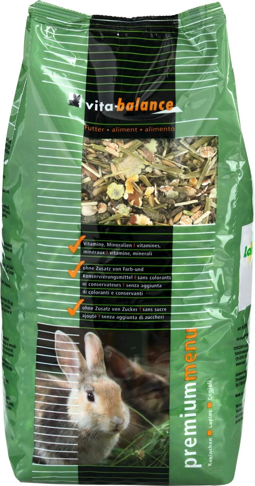 Das Premium Kaninchenfutter von Vita-Balance ist geeignet für alle Kaninchenarten. Dies ist eine Abwechslungsreiche Mischung mit allen wichtigen Nährstoffen. Das faserreiche Futter ist ausserdem gut für die Verdaaung und hilft den Kaninchen die Zähne in Form zu halten. Das Hasenfutter deckt den Nährstoffbedarf Ihres Kaninchen und wird durch die vielen verschiedenen Flocken gerne gefressen. Neben den Pellets ist auch unter anderem Hafer, Maisflocken, Weizenflocken und Bananenchips enthalten. Dieses Alleinfuttermittel ist frei von Zucker, Farb- und Konservierungsstoffen.
