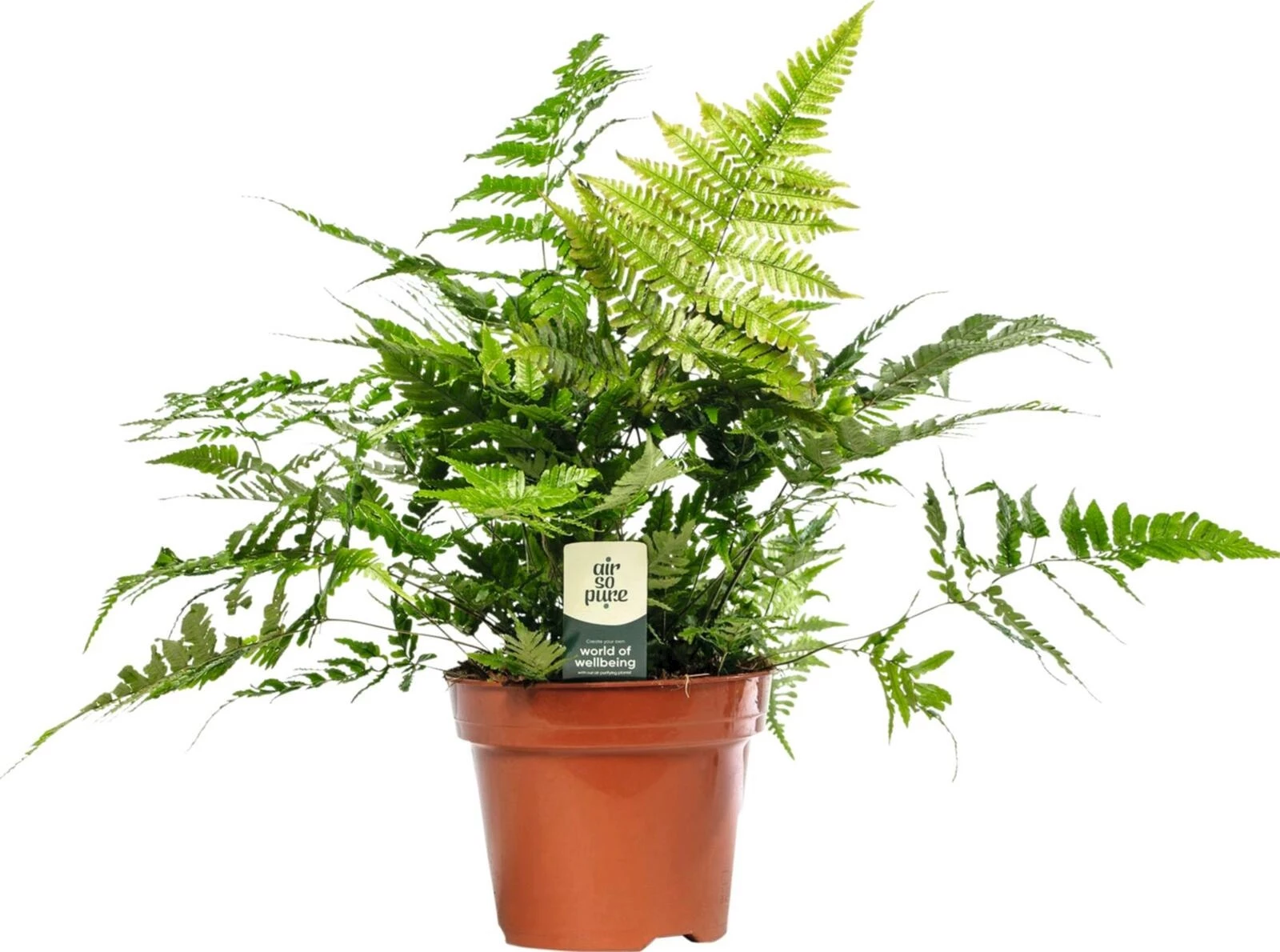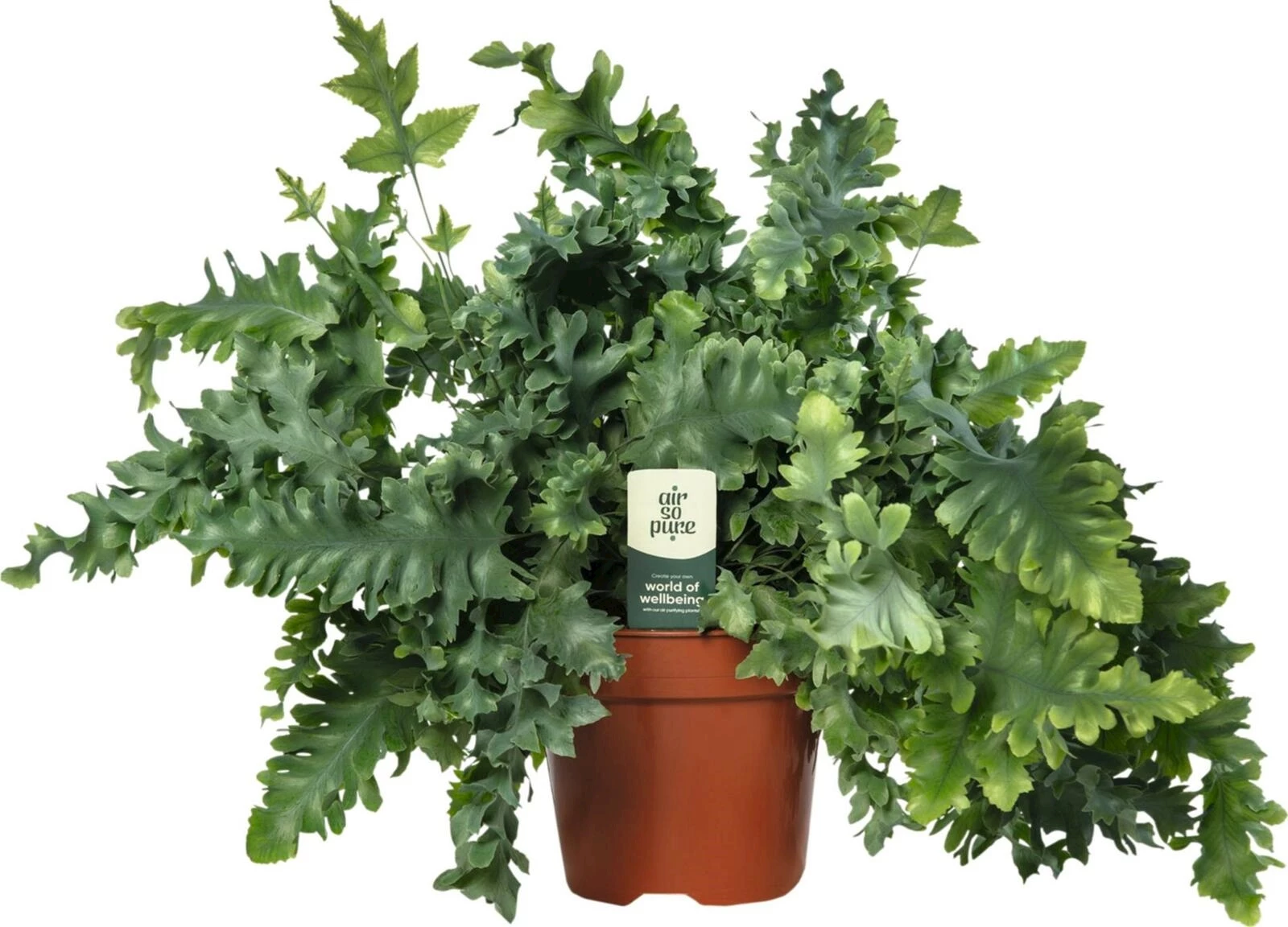 Phlebodium 'Blue Star' (Blaues Sternfarn): Ca. 30–45 cm, Nephrolepis exaltata 'Green Lady' (Grüne Lady): Ca. 40–60 cm, Didymochlaena truncatula (Kleinblättriger Farn): Ca. 30–60 cm, Dryopteris erythrosora (Roter Fadenfarn): Ca. 30–60 cm, Phlebodium davana (Davana Farn): Ca. 30–45 cm, Blechnum 'Silver Lady' (Silber Lady Farn): Ca. 45–60 cm.