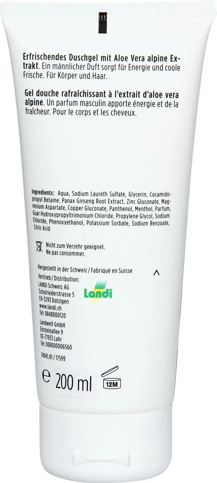 Beauté Suisse. Erfrischendes Duschgel mit natürlichem Aloe Vera alpine Extrakt. Männlicher Duft sorgt für Energie und eine coole Frische. Für Körper und Haar. Vegan. 200 ml.