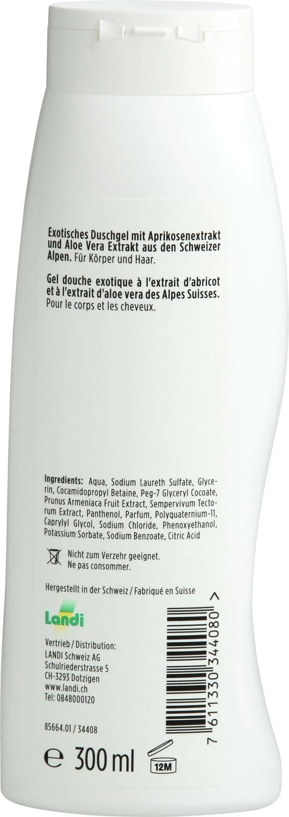 Beauté Suisse. Veganes Duschgel mit natürlichem Aprikosenextrakt und Aloe Vera. Für Körper und Haar. 300 ml.