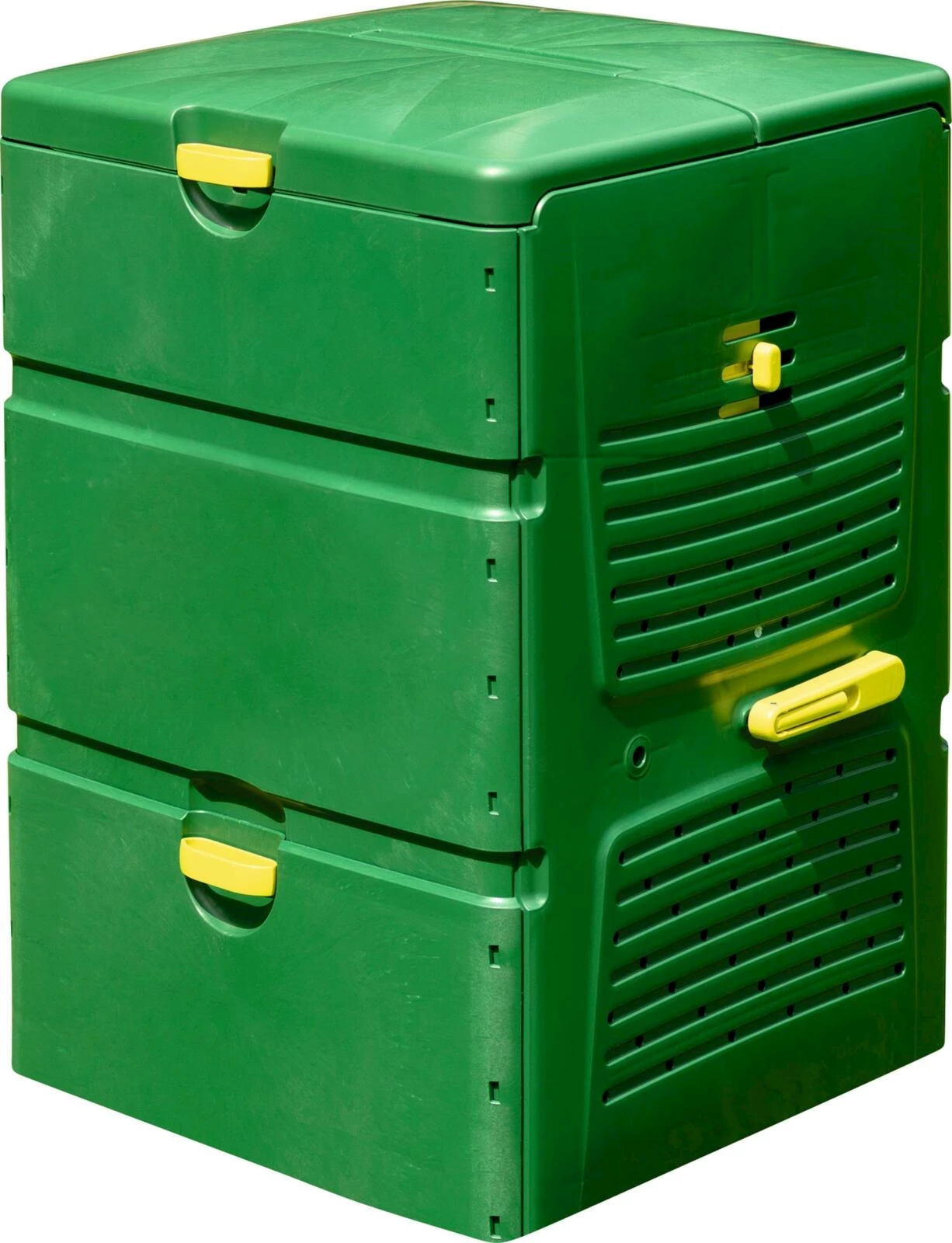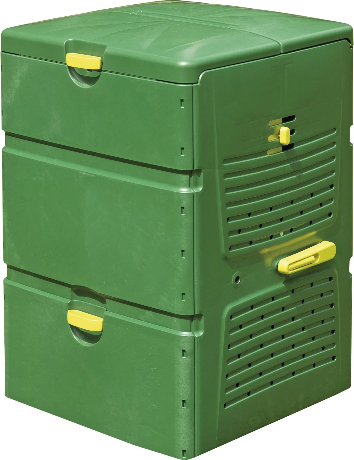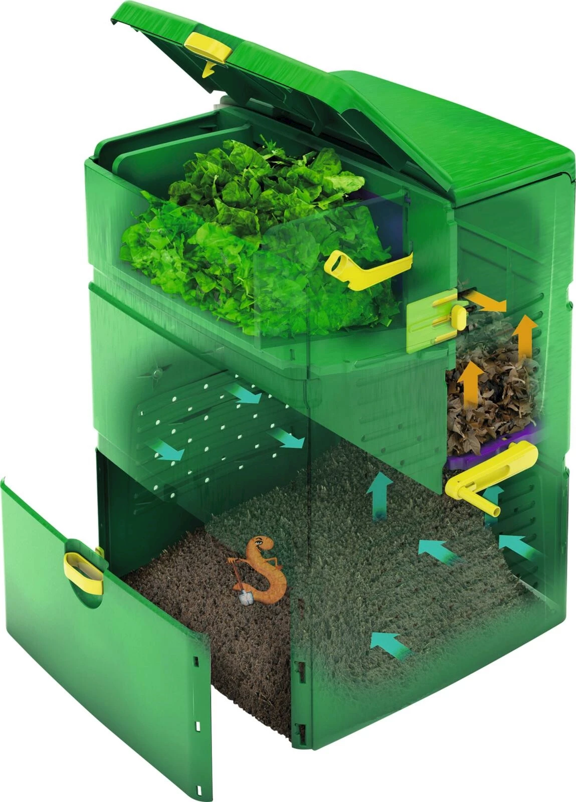 Intelligentes Mehrkammersystem ohne mühsames Umsetzen des Kompostes. Regulierbare Belüftung. Schutz vor Mäusen und Ratten.