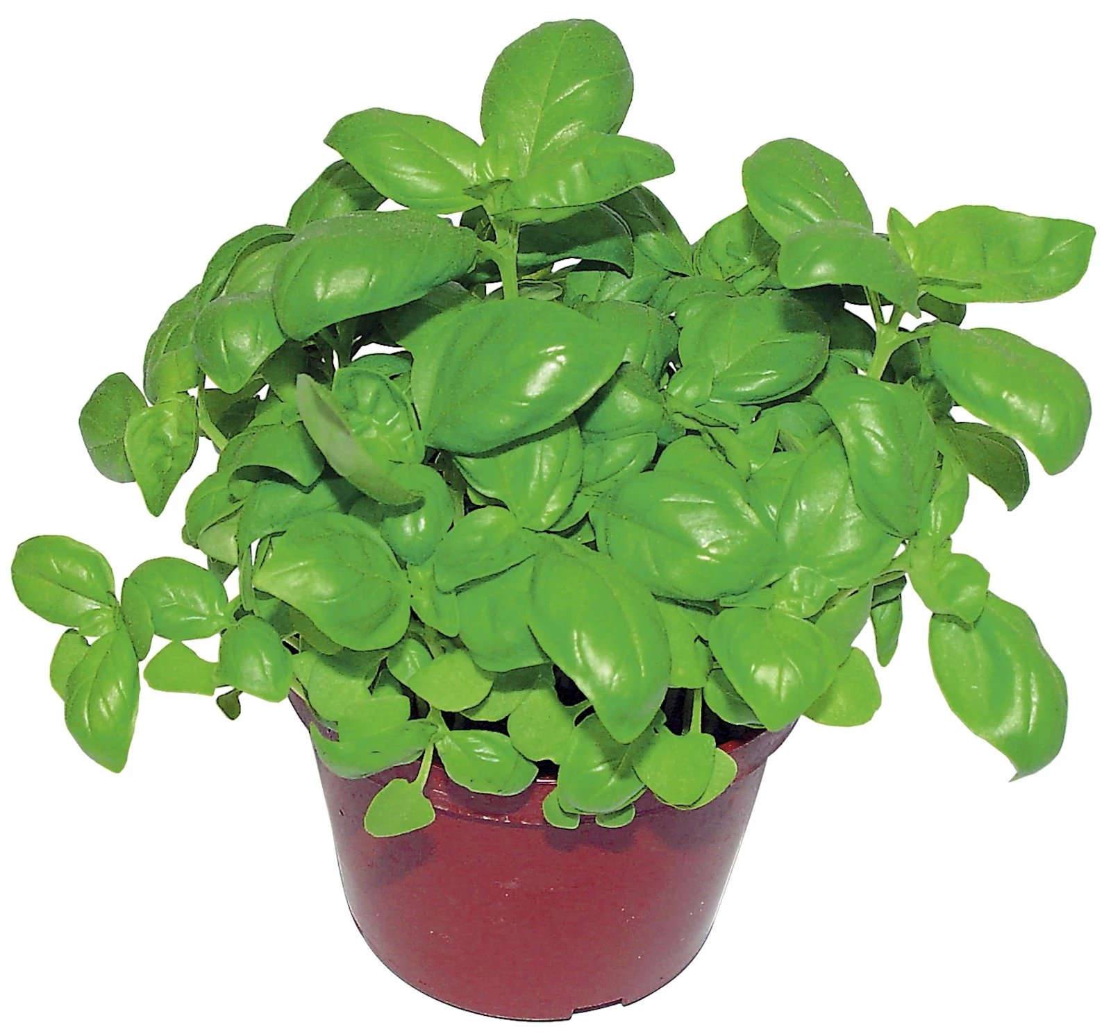 Basilikum (Ocimum basilicum) ist eine einjährige, aromatische Pflanze mit grünen Blättern und intensivem, süss-würzigem Duft. Es wird häufig in der mediterranen Küche für Pesto, Salate, Pasta und Saucen verwendet.