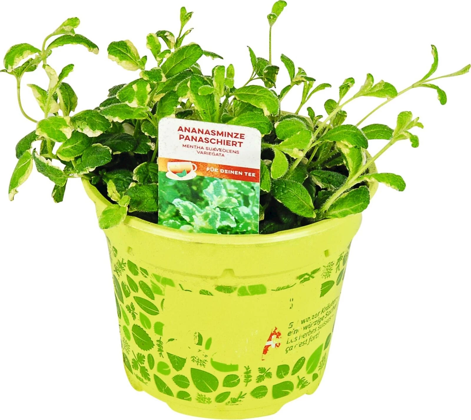Die Ananasminze (Mentha suaveolens 'Variegata') ist eine mehrjährige Heil- und Würzpflanze. Ihre panaschierten Blätter verströmen ein fruchtiges Aroma. Sie bevorzugt einen sonnigen bis halbschattigen Standort mit einem mässig feuchten, nährstoffreichen und leicht kalkhaltigen Boden. In den Monaten Juni bis September blüht sie leicht rosa/weiss. Die Minze ist frosthart und vermehrt sich stark durch Ausläufer. Das Aroma der Blätter passt hervorragend zu erfrischende Tees, gekühlte Sommer-Drinks und weiteren Getränken. Kann frisch der getrocknet verwendet werden.