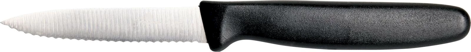 Das Spitzmesser ist mit einer Härte von 55 HRC perfekt geeignet zum Schneiden von Gemüse, Obst oder anderen Lebensmitteln. Die Klingenlänge ist spülmaschinengeeignet, 8 cm lang und der Schliff ist wellenförmig. Der Griff ist aus Polypropylen.