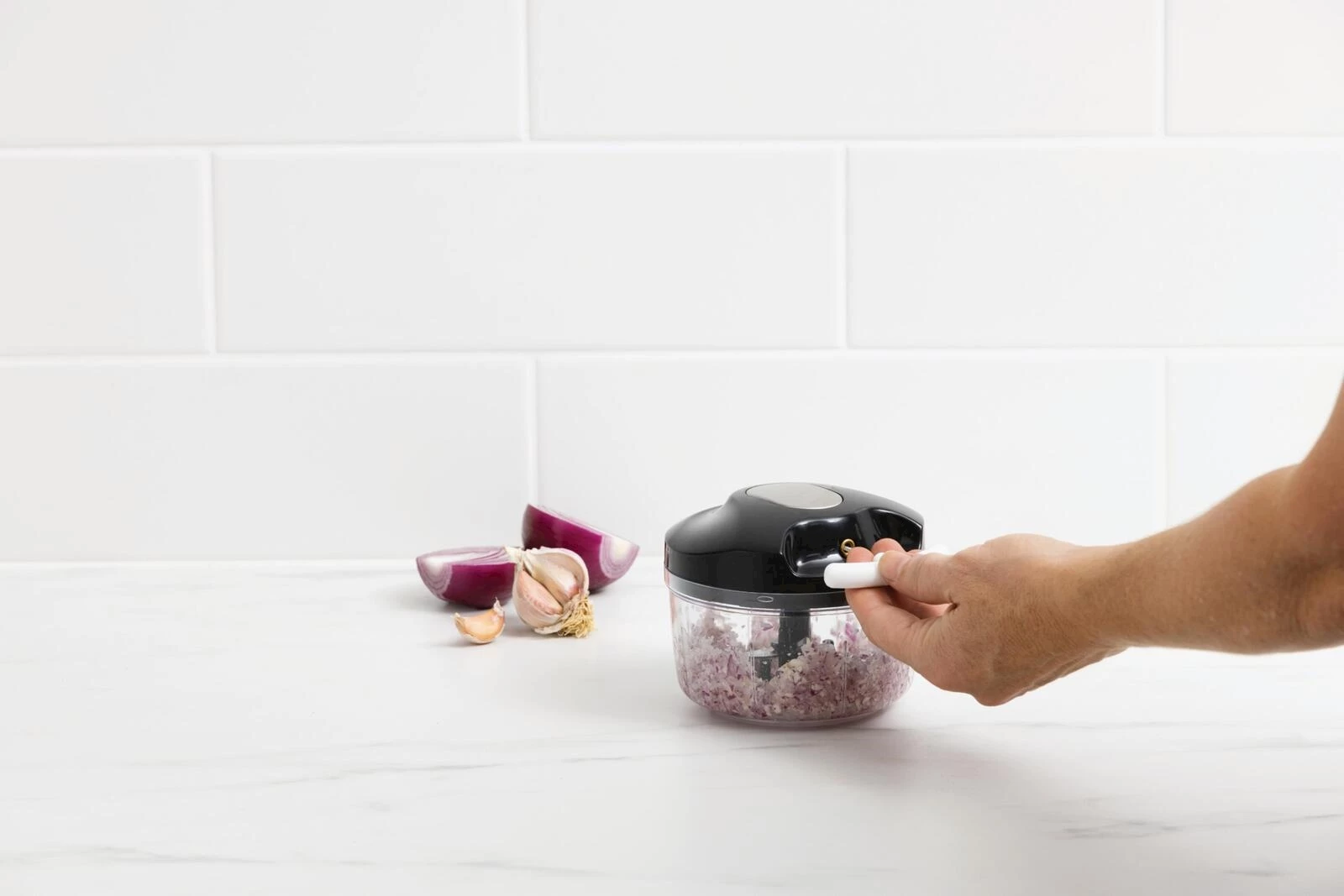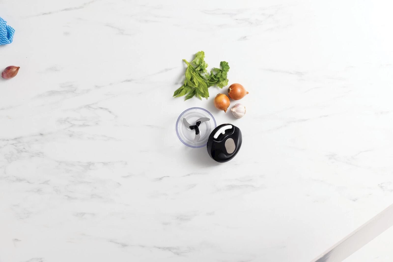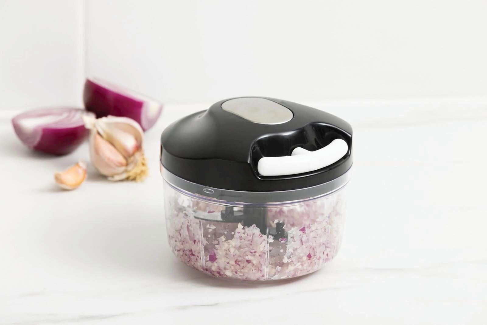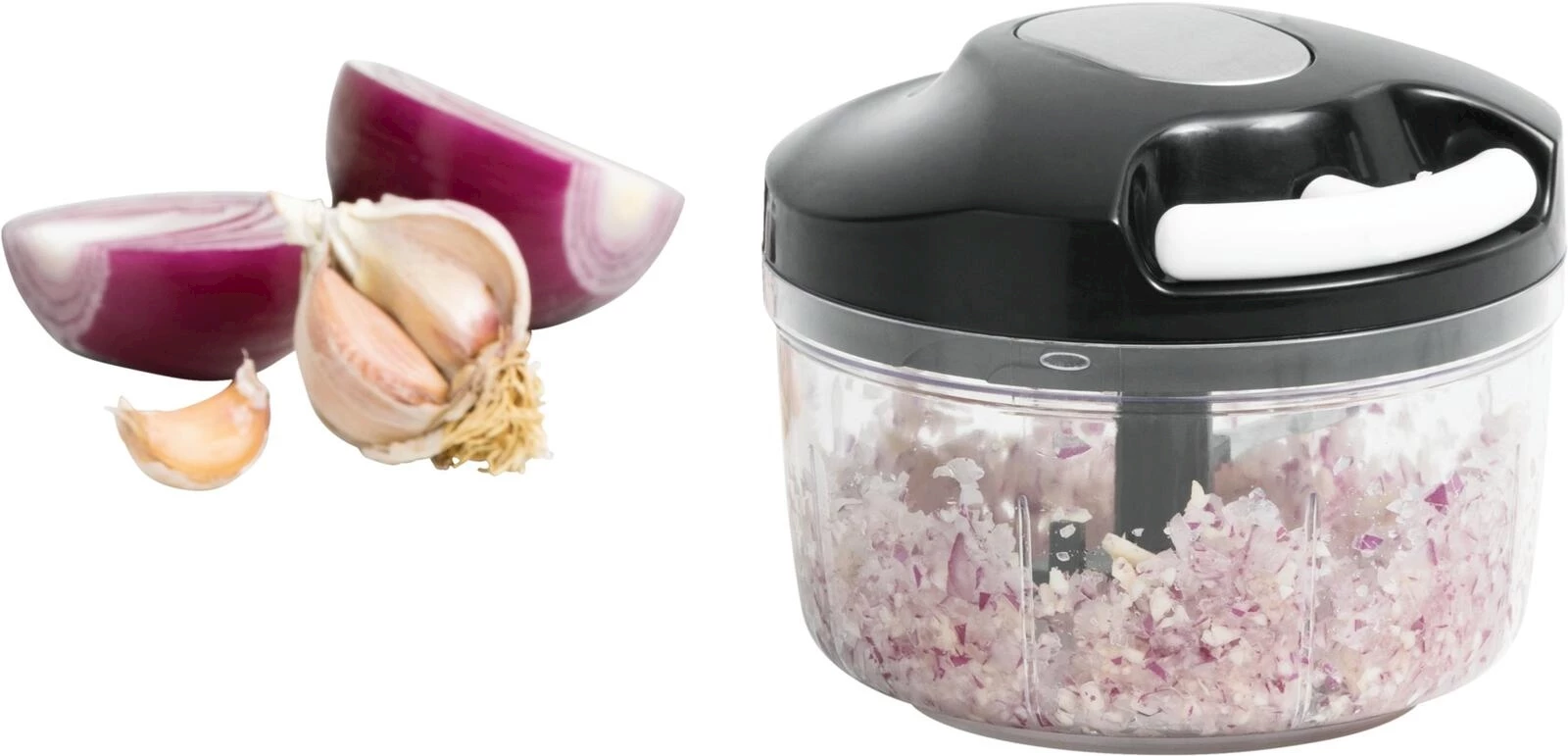 Der kompakte Multizerkleinerer von Prima Vista mit Seilzug ist die praktische Lösung für die schnelle Verarbeitung von Gemüse im Alltag. Mit einem Fassungsvermögen von 500 ml eignet sich der Zerkleinerer ideal für kleinere Mengen, ob Zwiebeln, Kräuter oder Paprika. Durch den manuellen Seilzugmechanismus lässt sich das Schneidwerk flexibel und stromunabhängig bedienen, wodurch Sie jederzeit die volle Kontrolle über den Zerkleinerungsgrad behalten. Die drei Klingen aus rostfreiem Edelstahl (Typ 420) sorgen für ein gleichmässiges und effizientes Schnittergebnis. Der Behälter aus BPA-freiem Kunststoff (PP,PS) ist robust und leicht zu reinigen. Der Behälter ist spülmaschinenfest, lediglich der Deckel sollte per Hand gereinigt werden. Mit kompakten Abmessungen von 11,5 × 11,5 × 10 cm und einem Eigengewicht von nur 193 g ist dieser Küchenhelfer platzsparend verstaubar.