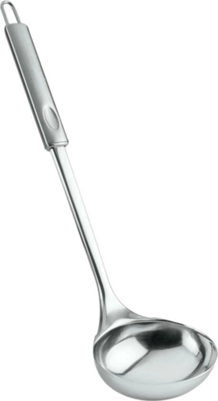 Der Schöpflöffel Merkur aus rostfreiem Edelstahl darf in keiner gut ausgestatteten Küche fehlen. Der ovale, hermetisch geschlossene Griff liegt angenehm in der Hand und bietet beim Servieren von Suppen, Saucen oder Eintöpfen einen sicheren Halt. Dank des praktischen Bügels lässt sich der Schöpflöffel platzsparend an einer Küchenleiste aufhängen und ist so stets griffbereit. Nach dem Gebrauch kann er ganz einfach in der Spülmaschine gereinigt werden.