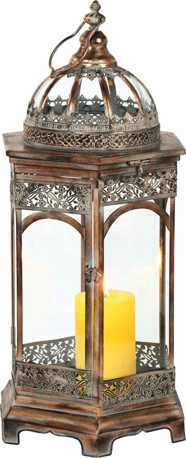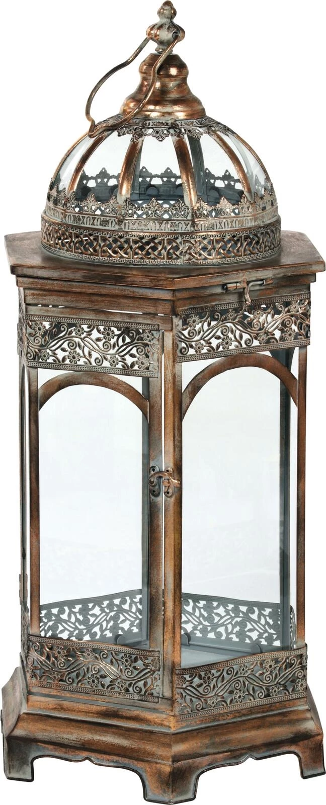 6-eckig mit verziertem Dach und Aufhängung. Ideal für Kerzen. Für den Innen- und Aussenbereich. Material: Metall, Glas.