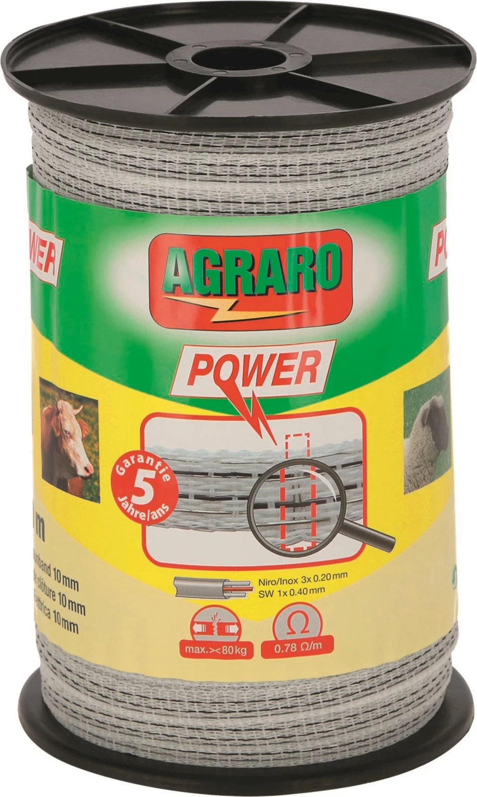 10 mm Weidezaunband. 200 m Länge. Höchste Reissfestigkeit und hohe Leitfähigkeit. Nur 0,78 Ohm/Meter.