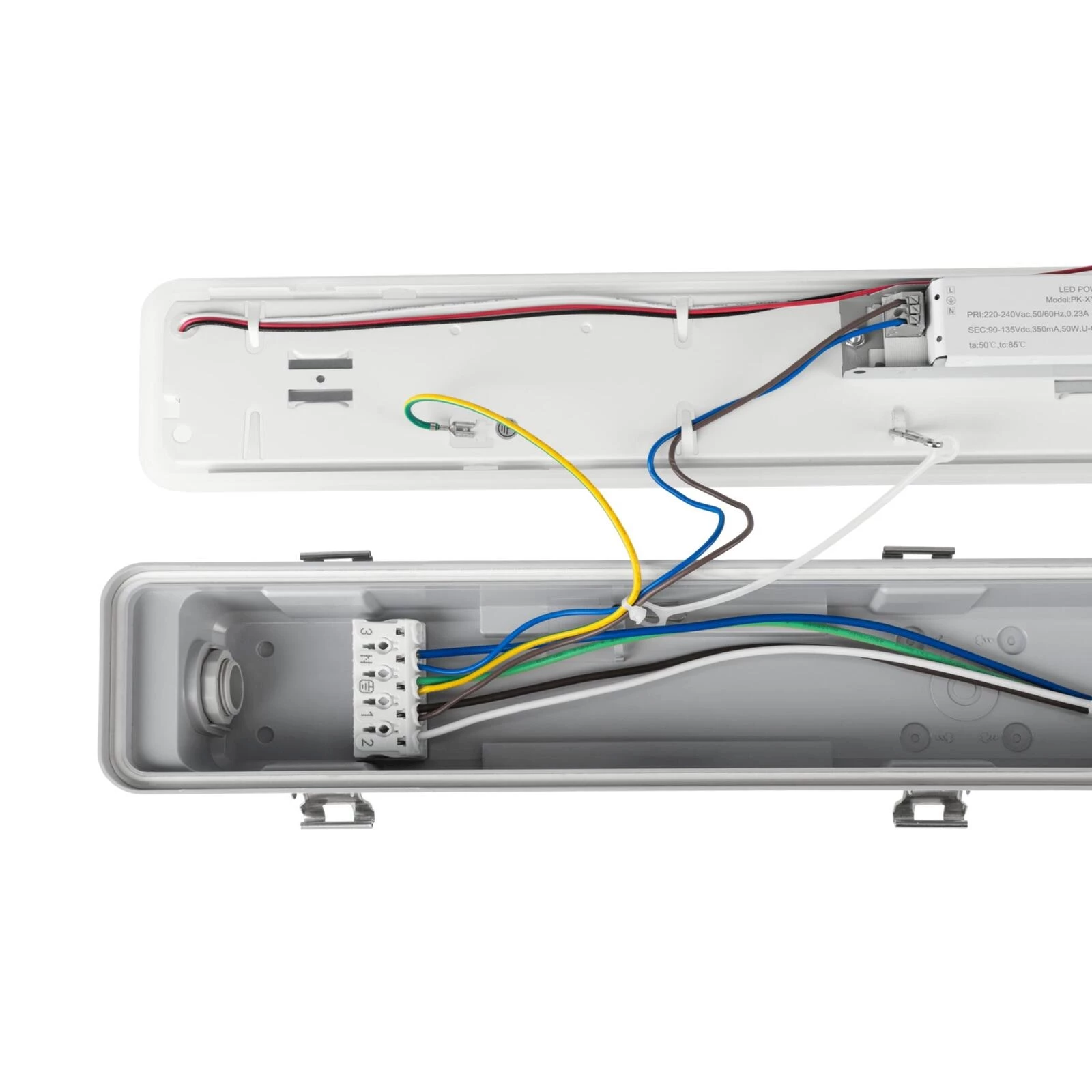 Ideal für Stall, Werkstatt und Industrie. Dimmbar und Farbtemperatur einstellbar. Mit IP69K, 5000 lm. Masse: 120 × 8,5 × 8 cm.