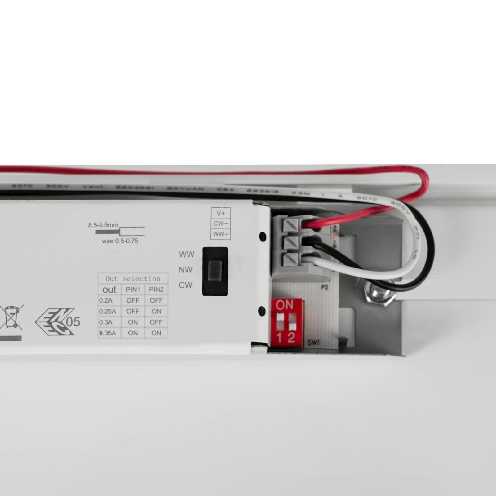 Die integrierte LED-Technologie sorgt für eine starke Lichtleistung von bis zu 5000 Lumen. Über einen praktischen DIP-Schalter lassen sich sowohl die Leistung (22 W, 28 W, 34 W oder 40 W) als auch die Farbtemperatur individuell anpassen. Zur Wahl stehen 3 000 K, 4 000 K oder 6 500 K, womit Sie stets die passende Beleuchtung für Ihren Einsatzbereich einstellen können. Die satinierte Abdeckung verteilt das Licht gleichmässig und blendfrei.