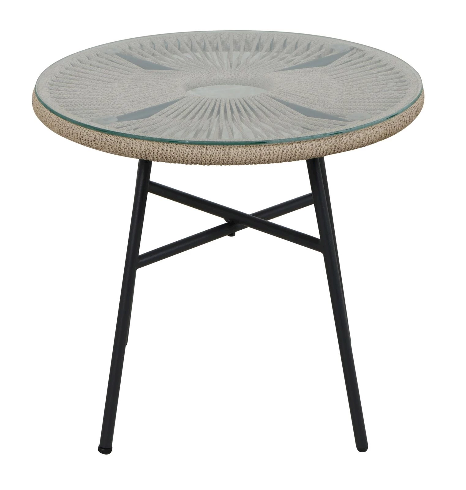 Elegantes Set aus Metall und Wicker mit passenden Polyesterkissen. Masse: Stühle: 85 × 73,8 × 101,5 cm, Tisch: 50 × 46,5 cm.