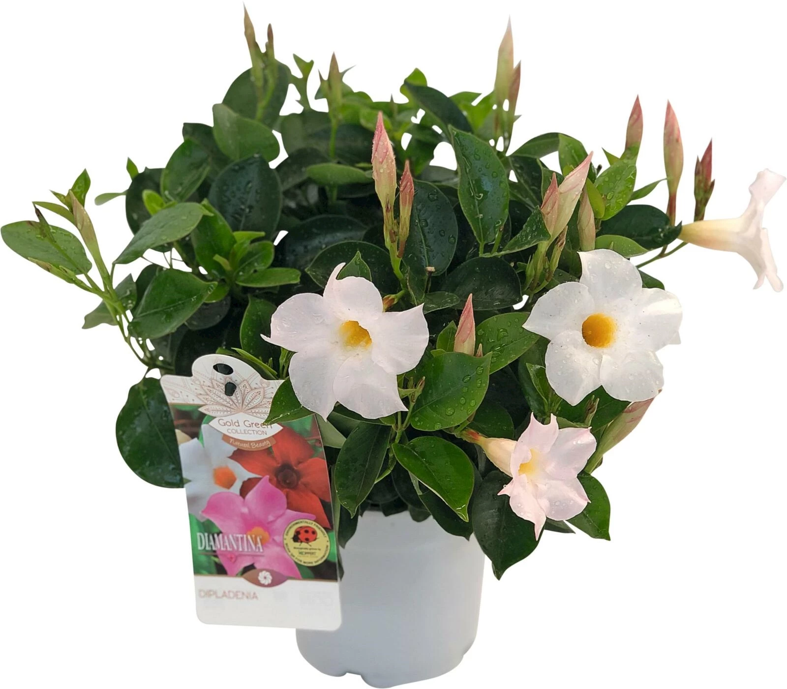 Die Dipladenia (Dipladenia x Hybrida) ist eine mehrjährige Kletterpflanze mit auffallenden Blüten und glänzenden dunkelgrünem Laub. Sie blühen ab Mai bis zum Herbst in den verschiedenen Farben. Die Dipladenien sind robust und pflegeleichte dauerblühende Schlingsträucher, die sich bei ausreichend Nahrung flott in die Höhe winden. Der Wasserbedarf einer Dipladenie ist mässig. In ihren dicken Blättern und Speicherwurzeln kann die Pflanze Wasser lange vorrätig halten. Die trichterförmigen Blüten der Mandevilla locken Insekten an. Achtung: Der weisse Milchsaft welcher bei Verletzung von Blättern und Stängeln austritt, schmeckt bitter und ist leicht giftig.