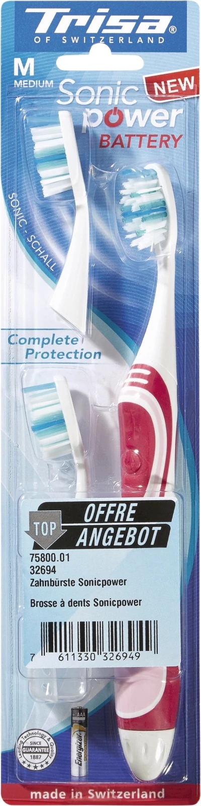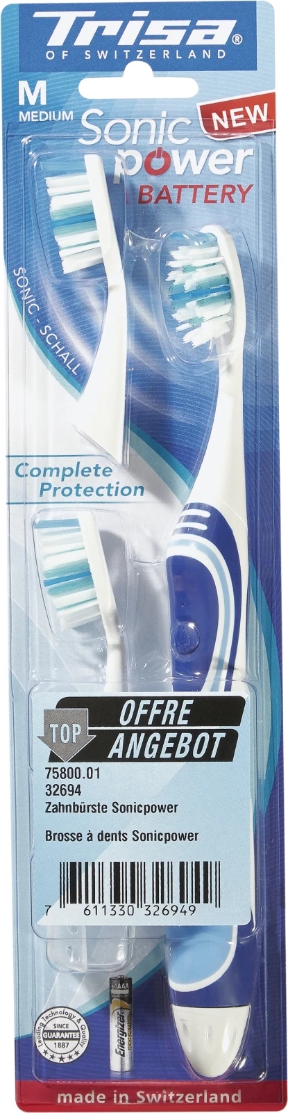 Die Trisa Schallzahnbürste Sonicpower Battery Medium hat ein innovatives Borstenfeld in Kombination mit hochfrequenten Schallbewegungen und reinigt äusserst effizient und schützt sowohl Zähne als auch Zahnfleisch. Inkl. Batterie (AAA).