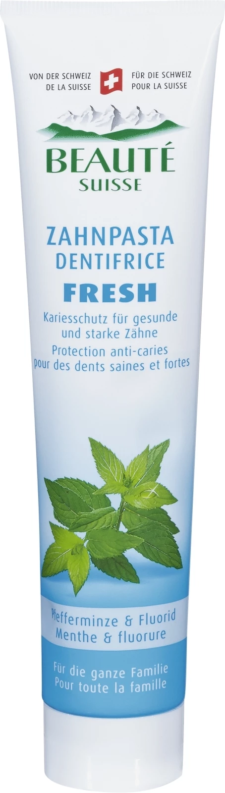 Beauté Suisse. Fresh Zahnpasta. Kariesschutz für gesunde und starke Zähne. Mit natürlichem Pfefferminzaroma und Fluorid. Für die ganze Familie.