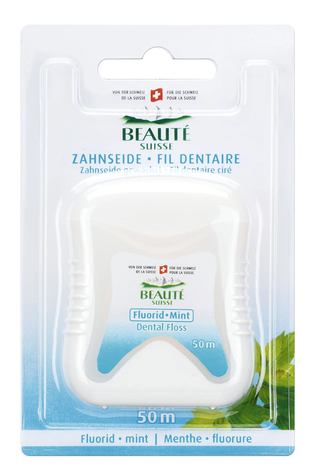 Beauté Suisse. Zahnseide Fluorid. Gewachst, Mint. Fasert nicht aus und gleitet mühelos durch Zahnzwischenräume. 50 m.