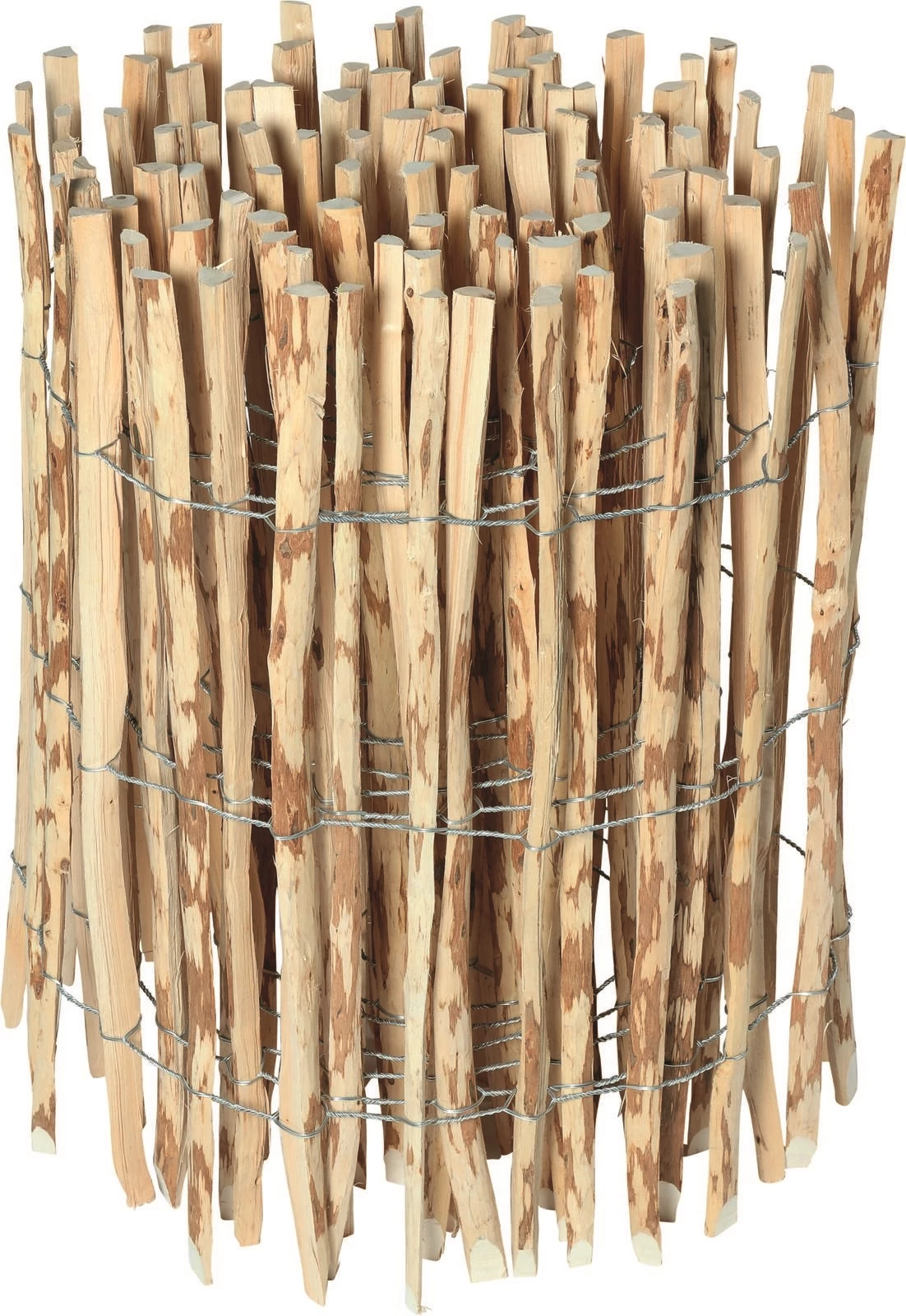 Rustikaler Staketenzaun, der im Garten und Aussenbereichen verwendet wird. Staketenabstand von ca. 8 cm. Holzart: Haselnuss.