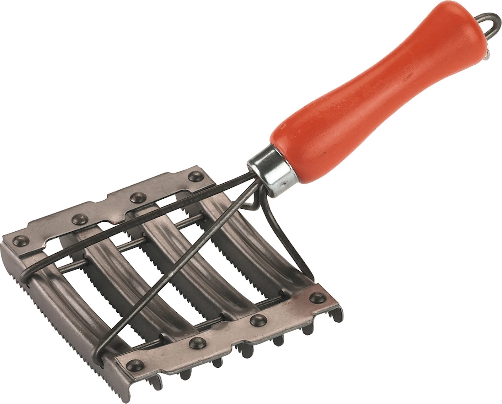 Für die Fellpflege bei Grossvieh. Der Metallstriegel mit Holzgriff ist 8-reihig und hat eine 4-fache Drahtangel. Er ist normal gezahnt. Masse: 11 × 12,5 cm.