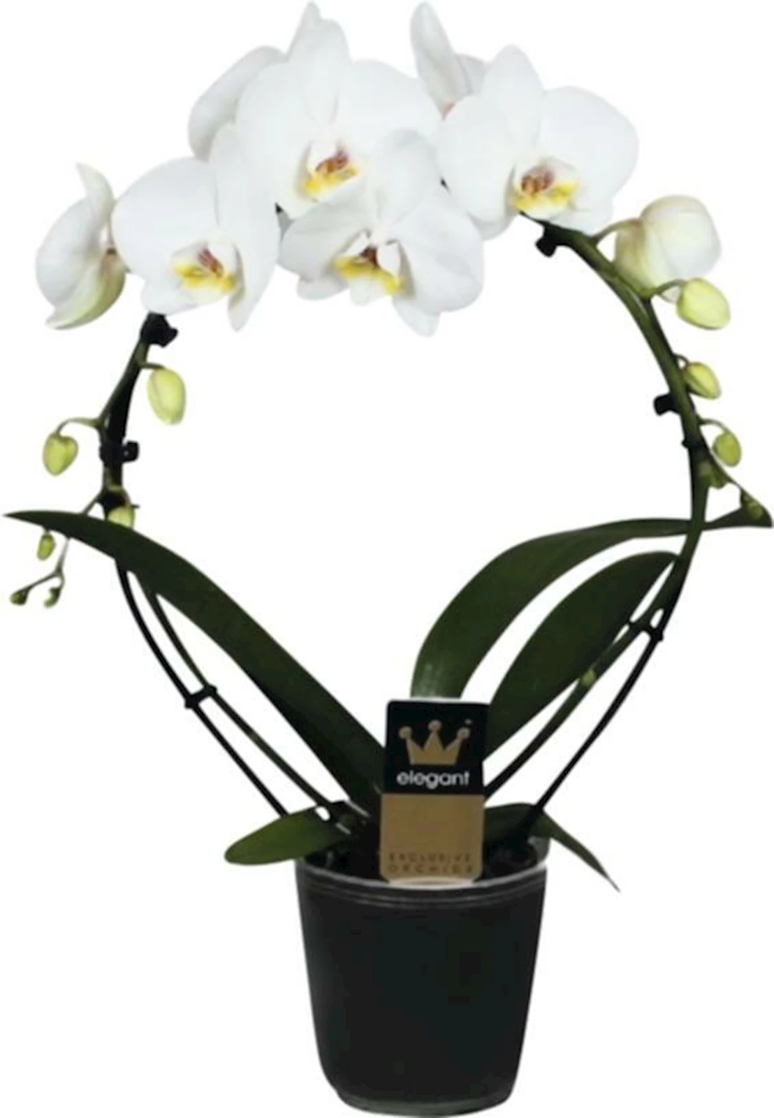 Die Phalaenopsis am Bogen weiss ist eine beliebte Orchideenart, die aufgrund ihrer eleganten weissen Blüten und ihrer Anspruchslosigkeit immer wieder gerne als Zimmerpflanze gewählt wird. Sie ist auch unter dem Namen Mottenorchidee bekannt und gehört zur Familie der Orchidaceae. Die Pflanze hat einen langen, aufrechten Stiel, an dem mehrere Blüten in einer Rispe wachsen. Die weissen Blüten haben eine leicht gewellte Form und einen schwarzen Fleck in der Mitte, der wie ein Auge aussieht. Die Pflanze hat grüne, lanzettliche Blätter, die an den Stielen wachsen.