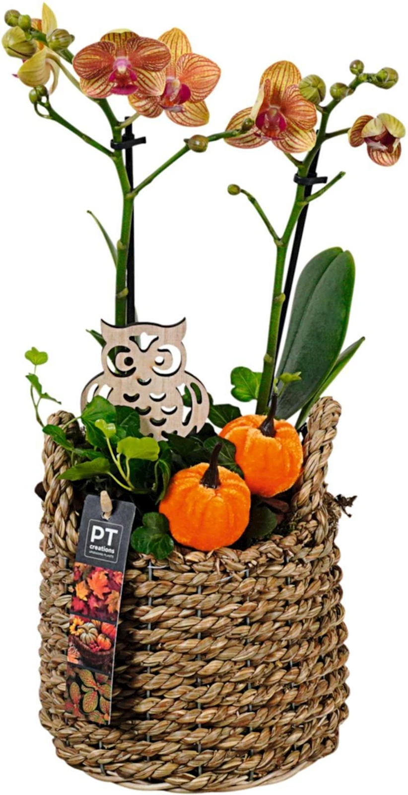 Herbstlich geschmücktes Phalaenopsis-Arrangement mit mehreren Knospen, erhältlich in verschiedenen Farben.