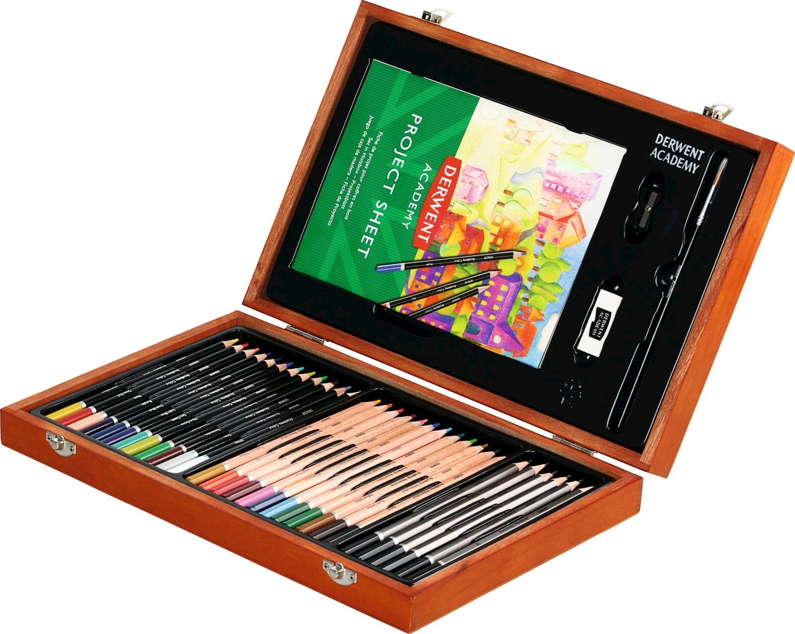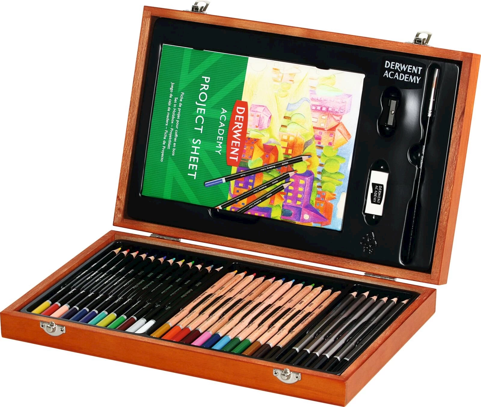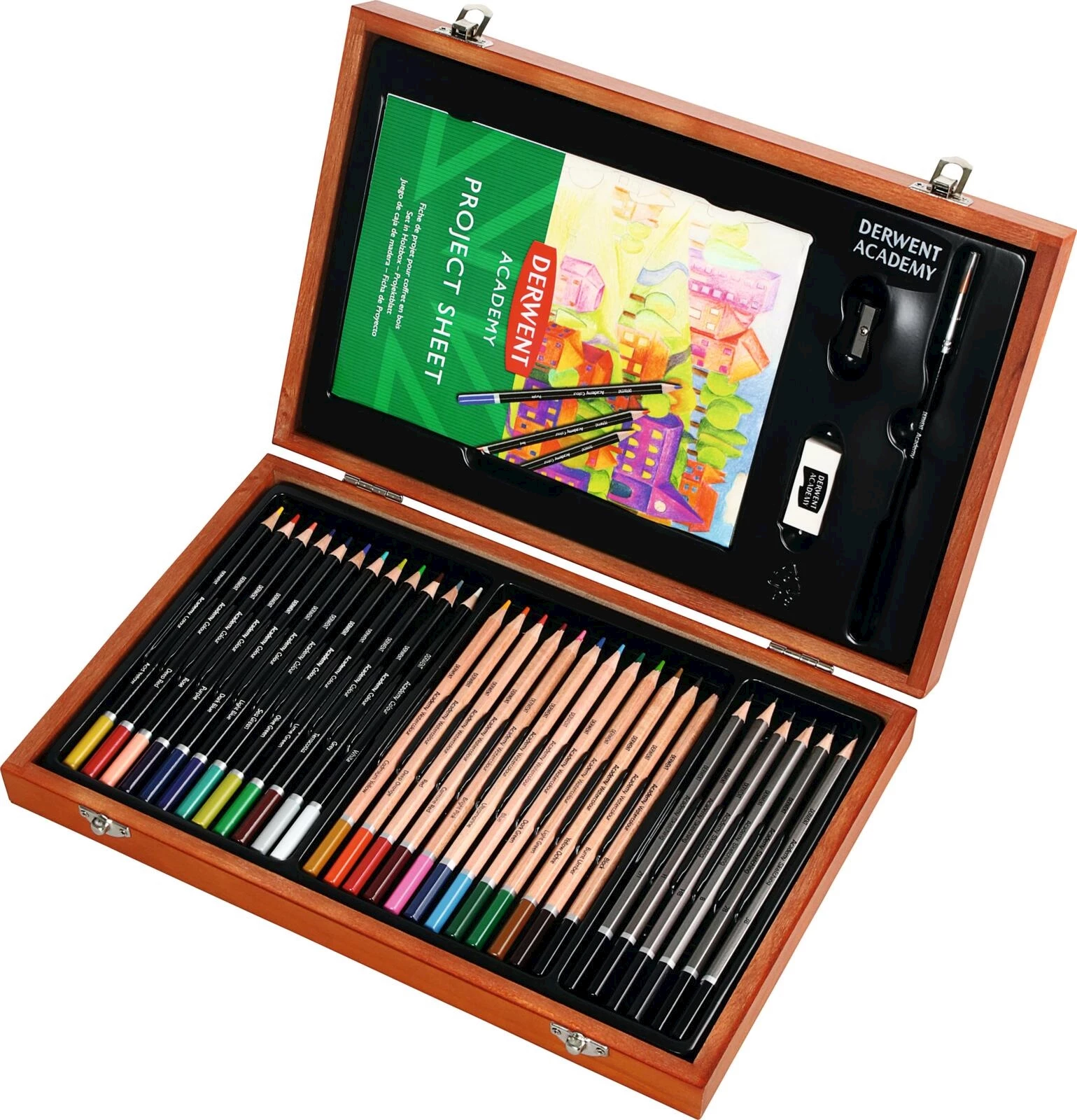 In der Holzschachtel sind 35 Stifte, darunter wasserverschmierbare, normale und Kohlestifte, sowie Pinsel, Spitzer, Gummi und eine Anleitung zum Zeichnen und Skizzieren.