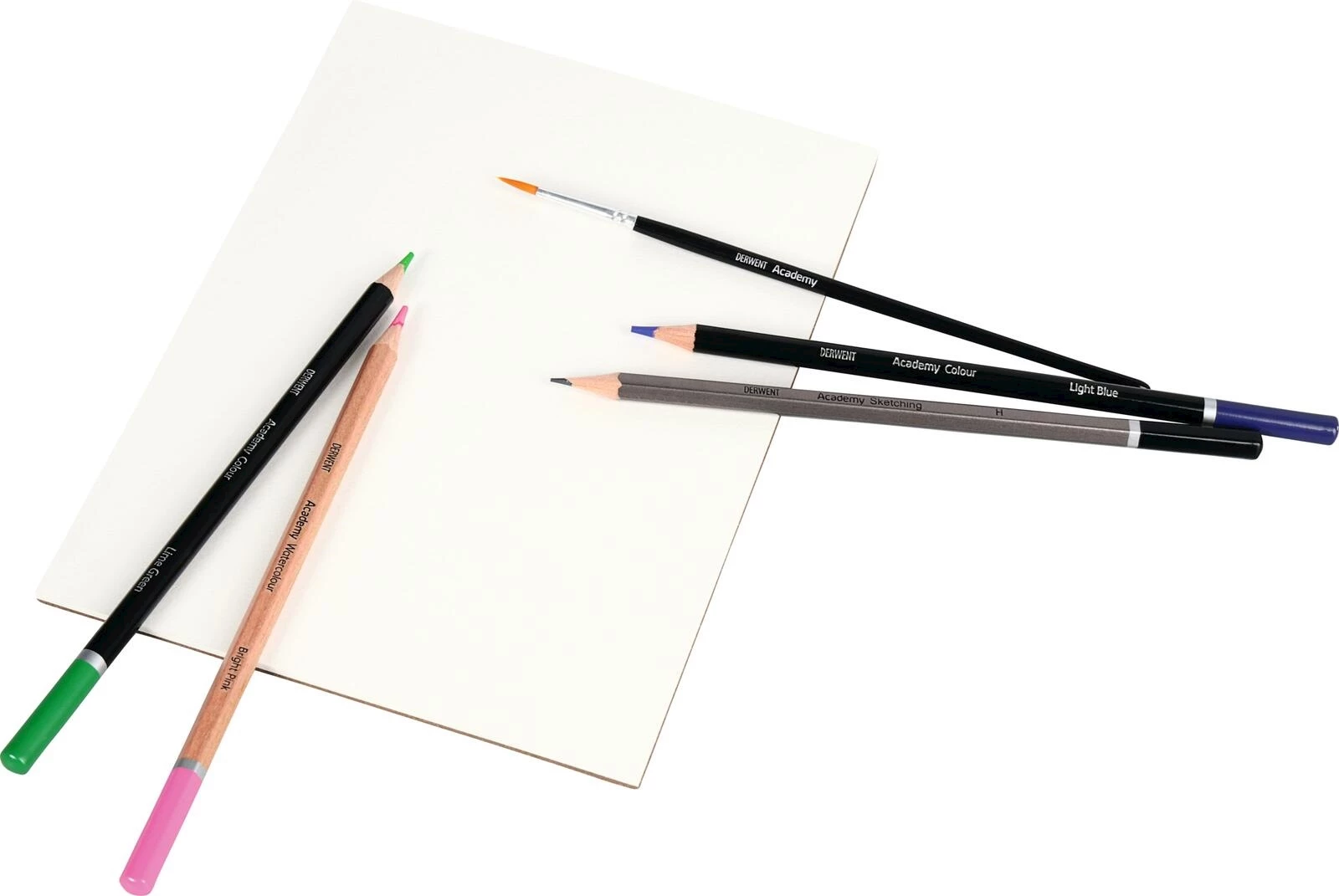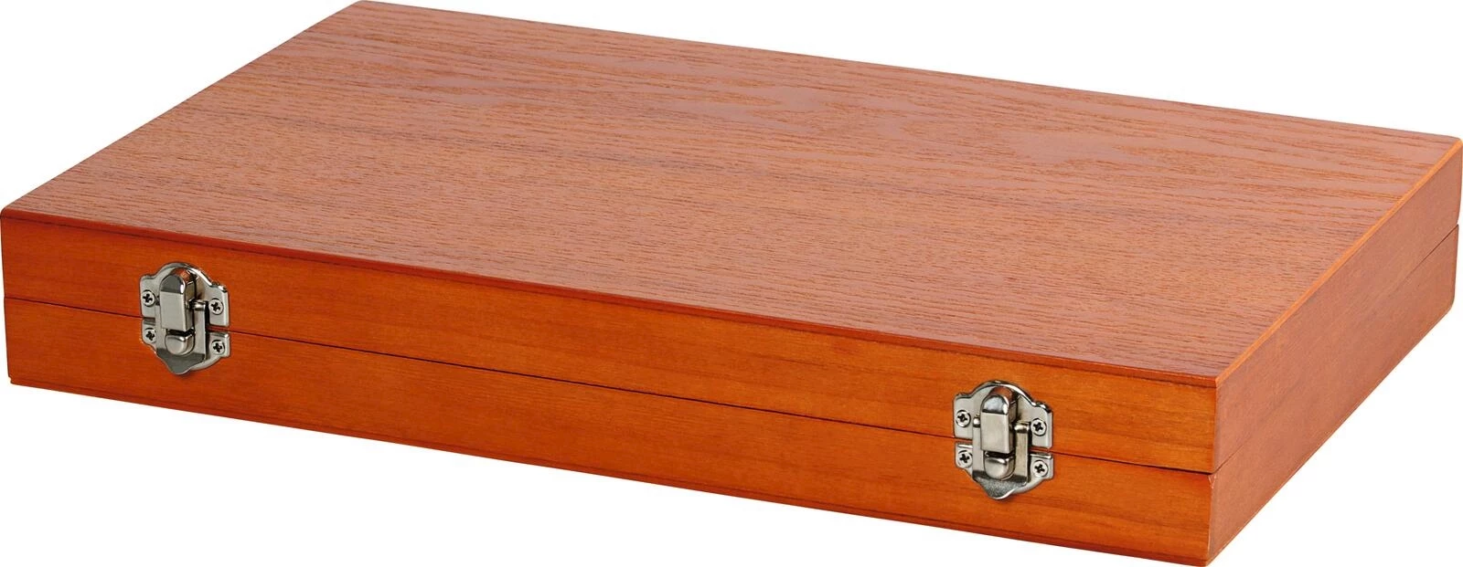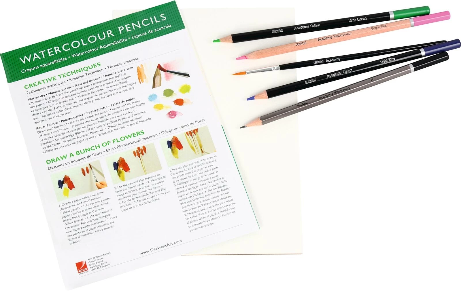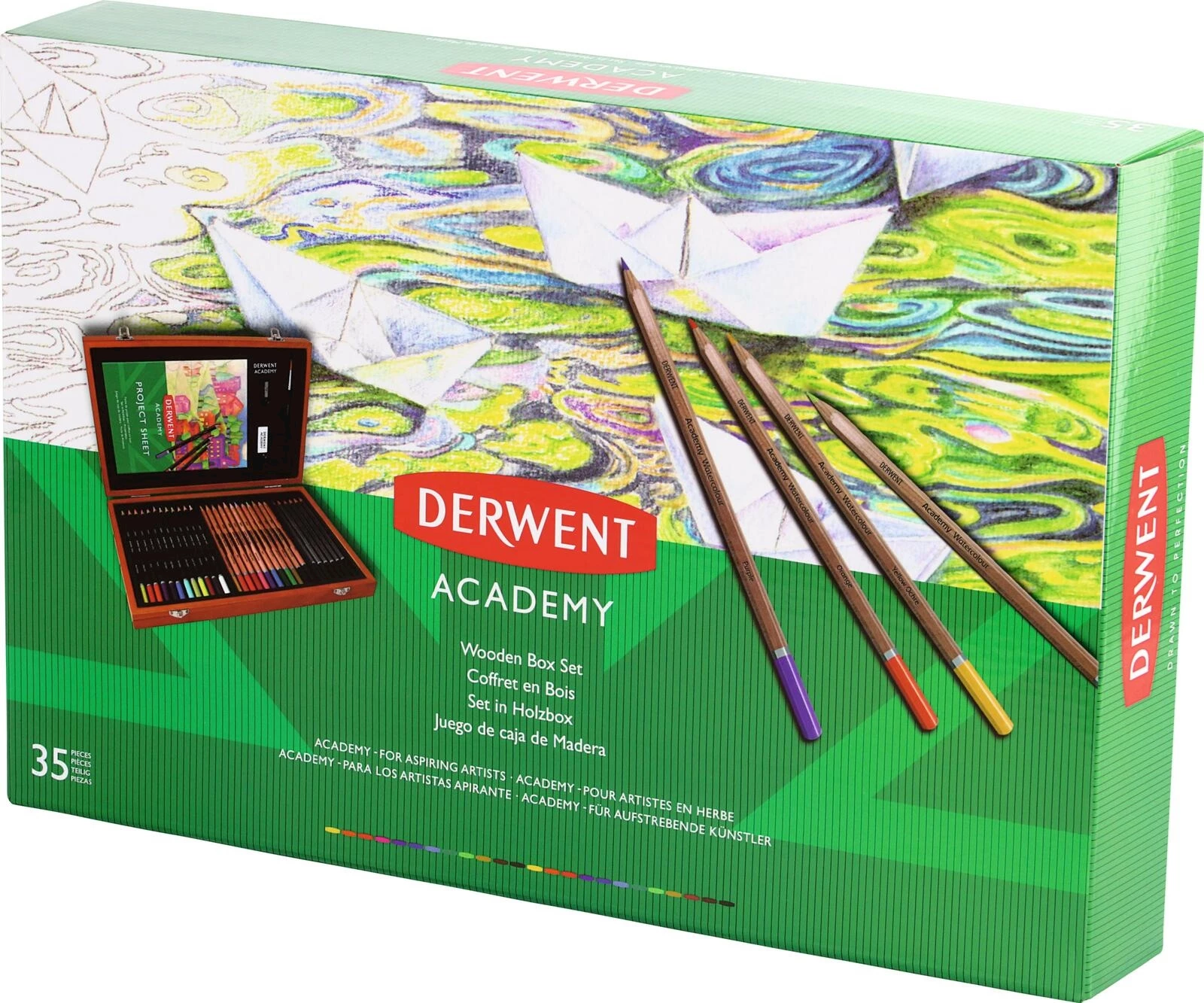 In der Holzschachtel sind 35 Stifte, darunter wasserverschmierbare, normale und Kohlestifte, sowie Pinsel, Spitzer, Gummi und eine Anleitung zum Zeichnen und Skizzieren.