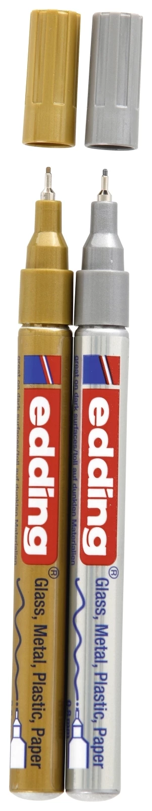 2 Stück Glanzlackmarker in den Farben Gold und Silber. Die 0,8 mm Mine haftet zuverlässig auf Glas, Metall und Papier. Auf dunklen und transparenten Oberflächen zeigt die Farbe ebenfalls eine stark deckende Wirkung und ist wetterfest, lichtecht, schnell trocknend, sowie hitzebeständig. Vor der Anwendung muss der Stift geschüttelt werden. Nach dem Öffnen der Kappe kann durch gleichmässigen Druck auf die Mine neue Farbe nach vorne gepumpt werden.