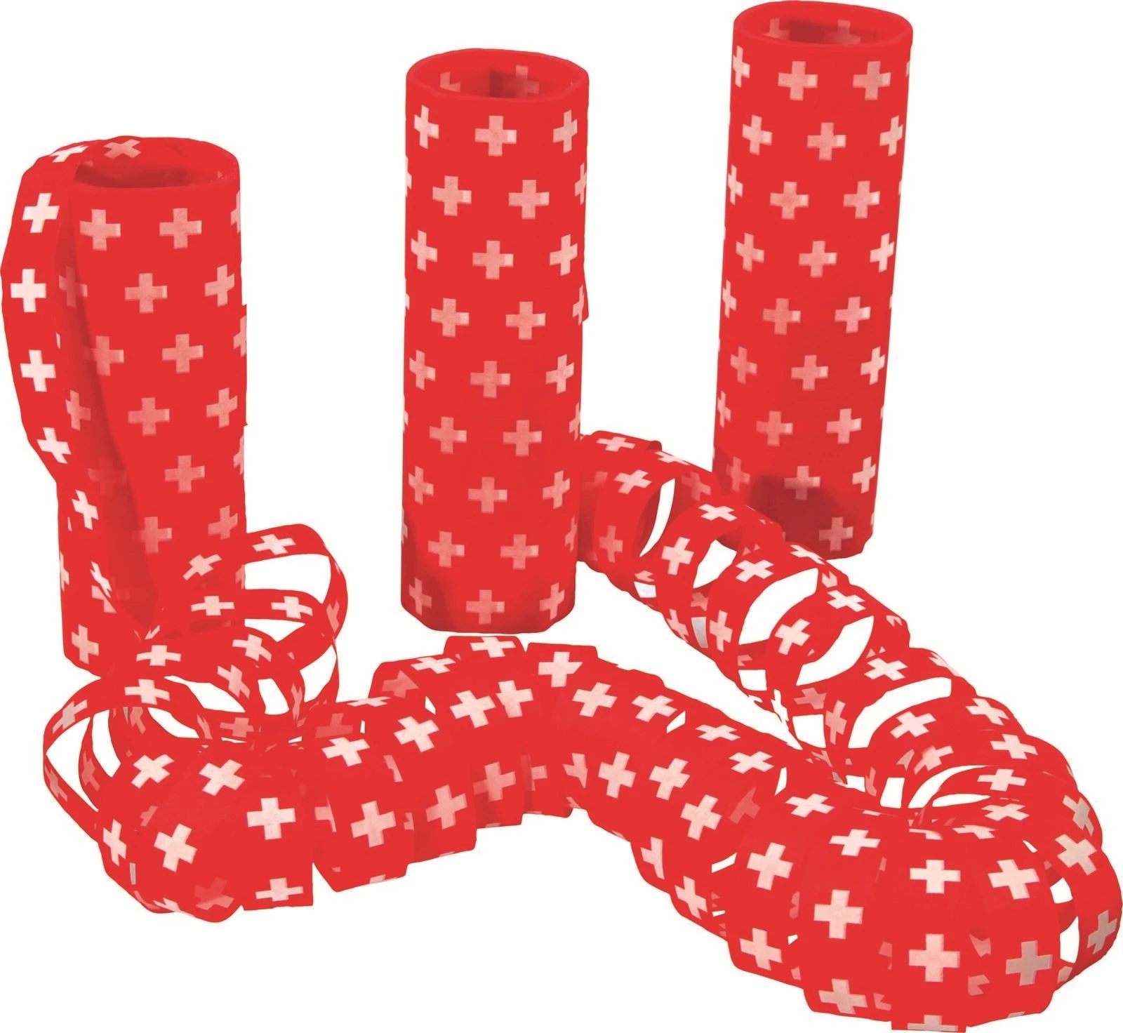 Rote Papier-Luftschlangen mit weissen Schweizer Kreuzen, perfekte Partydeko für den 1. August und Feste. Einfach in der Anwendung.