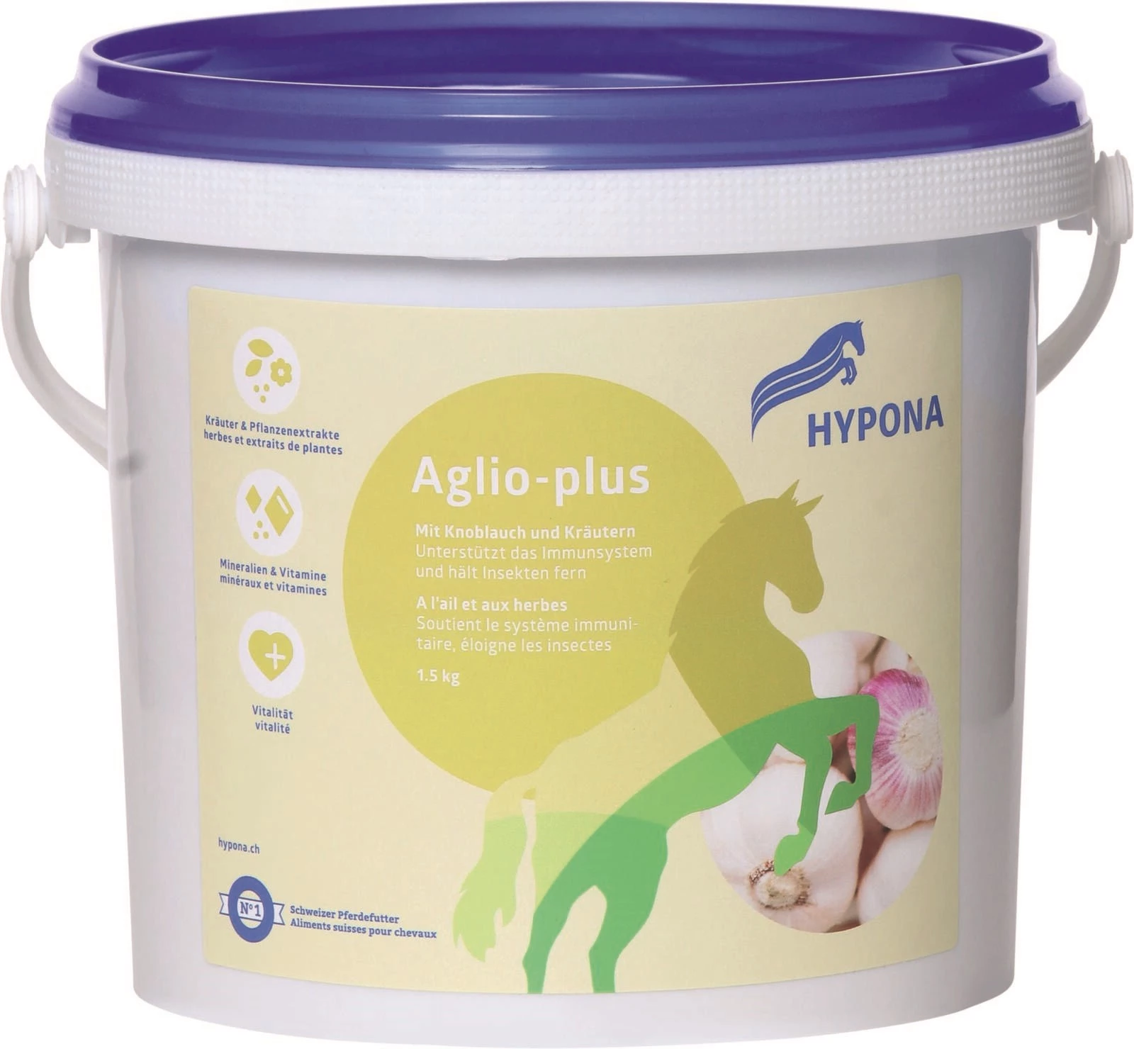 Das Zusatzfutter "Aglio-Plus" von Hypona unterstüzt in vielerlei Hinsichten das Immunsystem und hält zudem Insekten fern. Im Futter ist Knoblauch enthalten, er gehört zu den ältesten Heilpflanzen überhaupt. Er erhöht die Widerstandskraft vom gesamten Organismus, kräftigt das Herz und den Kreislauf und wirkt sich positiv auf die Verdauung aus. Zudem hält der intensive Knoblauchgeruch Insekten fern. Dadruch, da,s das Pulver auch diverse Kräuter enthält, stärkt es die Atmung und die Verdauung wird stabilisiert. Bitte das Zusatzfutter trocken, kühl und gut verschlossen aufbewahren. Eimer mit 1,5 kg Inhalt und inkl. Messlöffel.