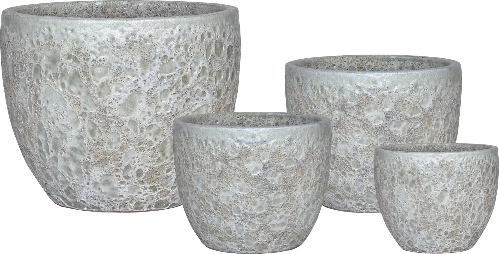 Die matte Oberfläche dieses Topfes entsteht durch eine spezielle Glasur, die nicht nur für die einzigartige Optik sorgt, sondern auch einen effektiven Schutz vor Feuchtigkeit bietet. Ursprünglich wurde der Topf mit einer sogenannten Blasen-Glasur überzogen. Diese wurde anschliessend wieder entfernt, ein Prozess, der diese besondere strukturierte Oberfläche zum Vorschein bringt.