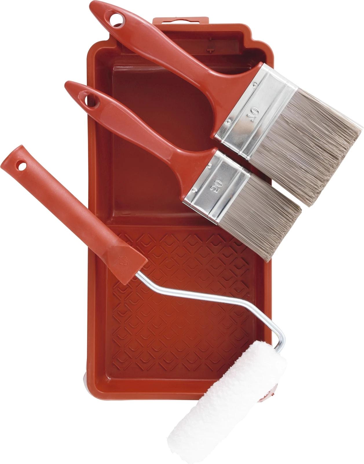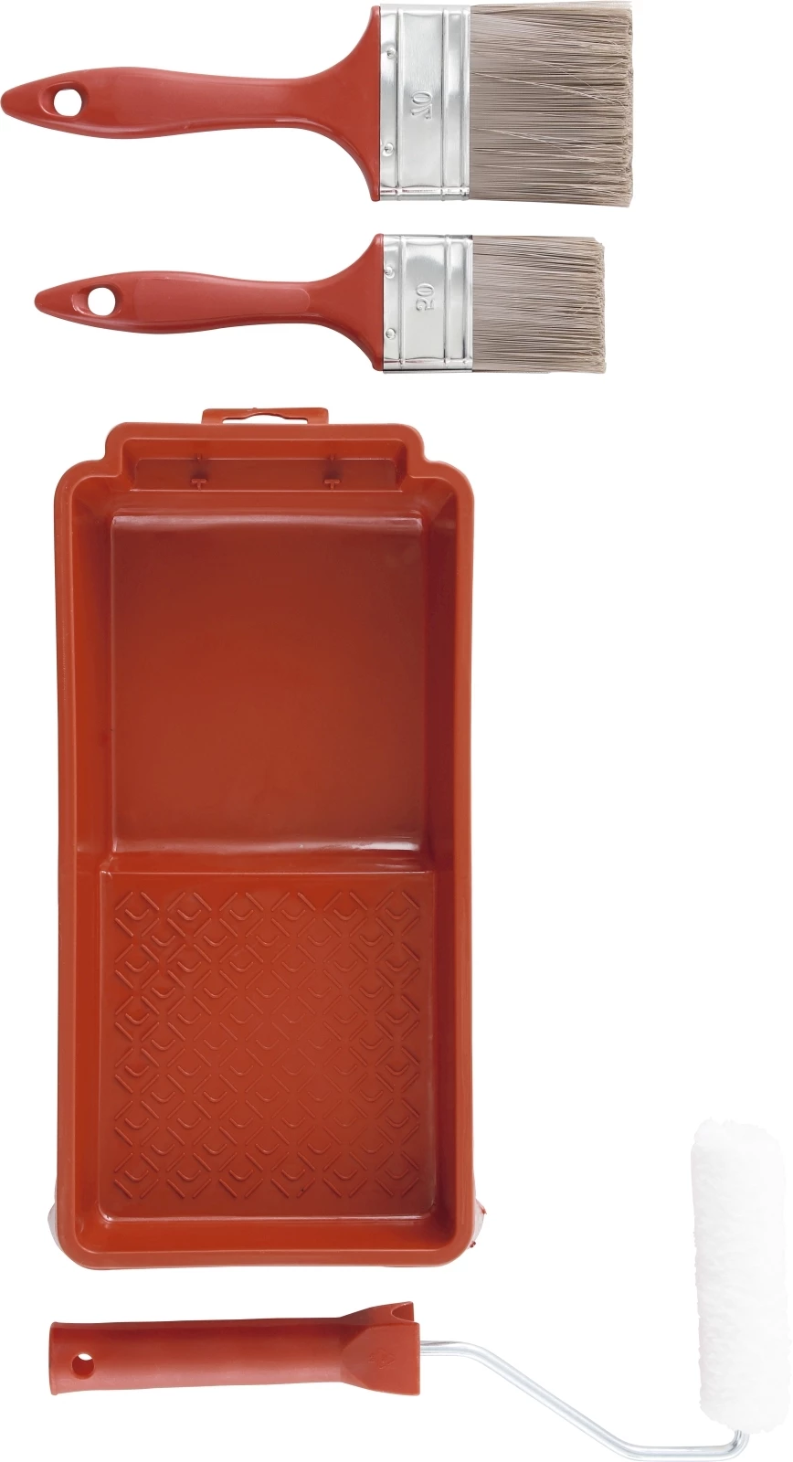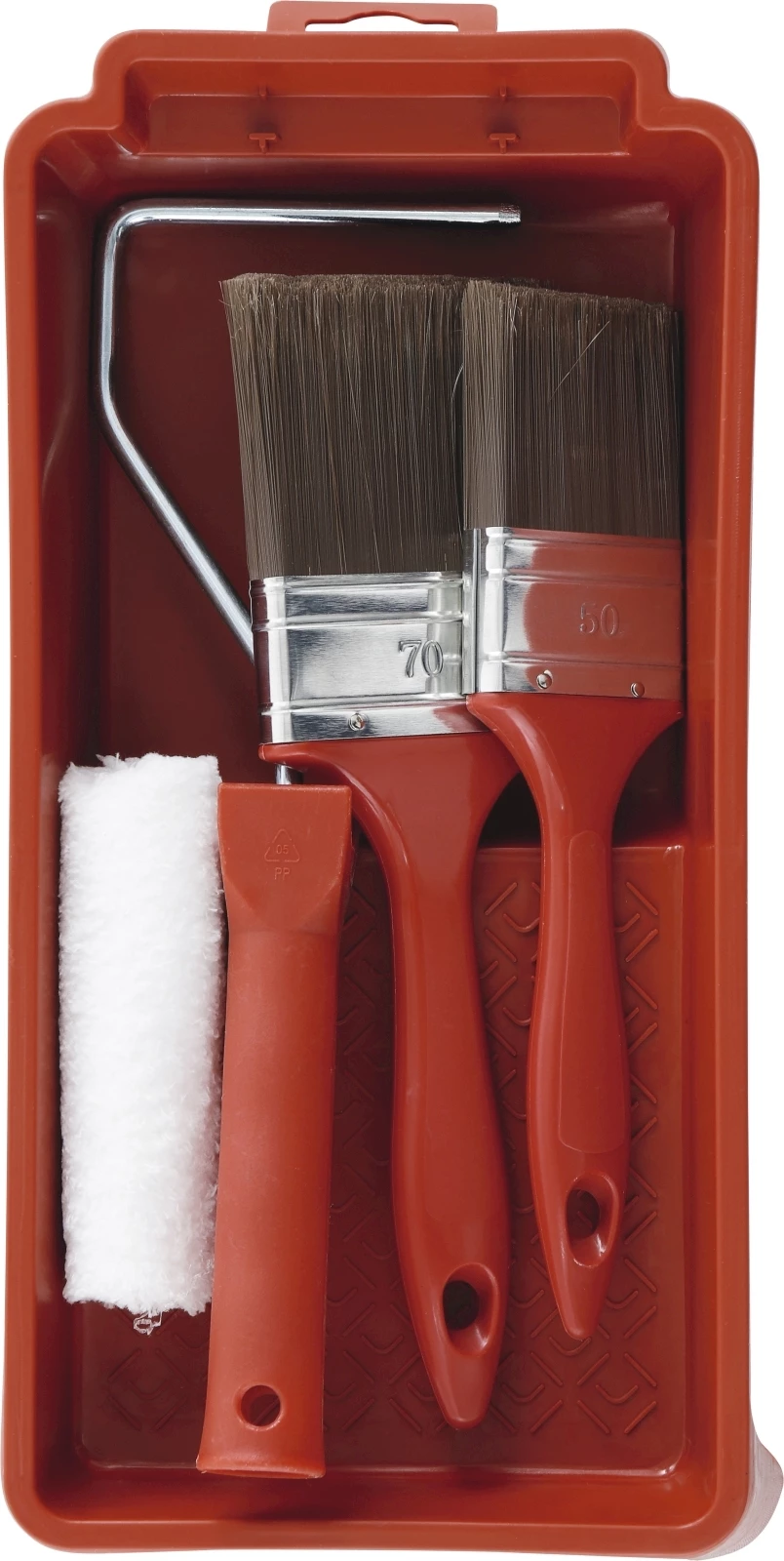 Zum Lasieren. Inhalt: 2 Pinsel (1 × 50 mm, 1 × 70 mm), 1 × Plüschwalze und 1 × Farbwalze.